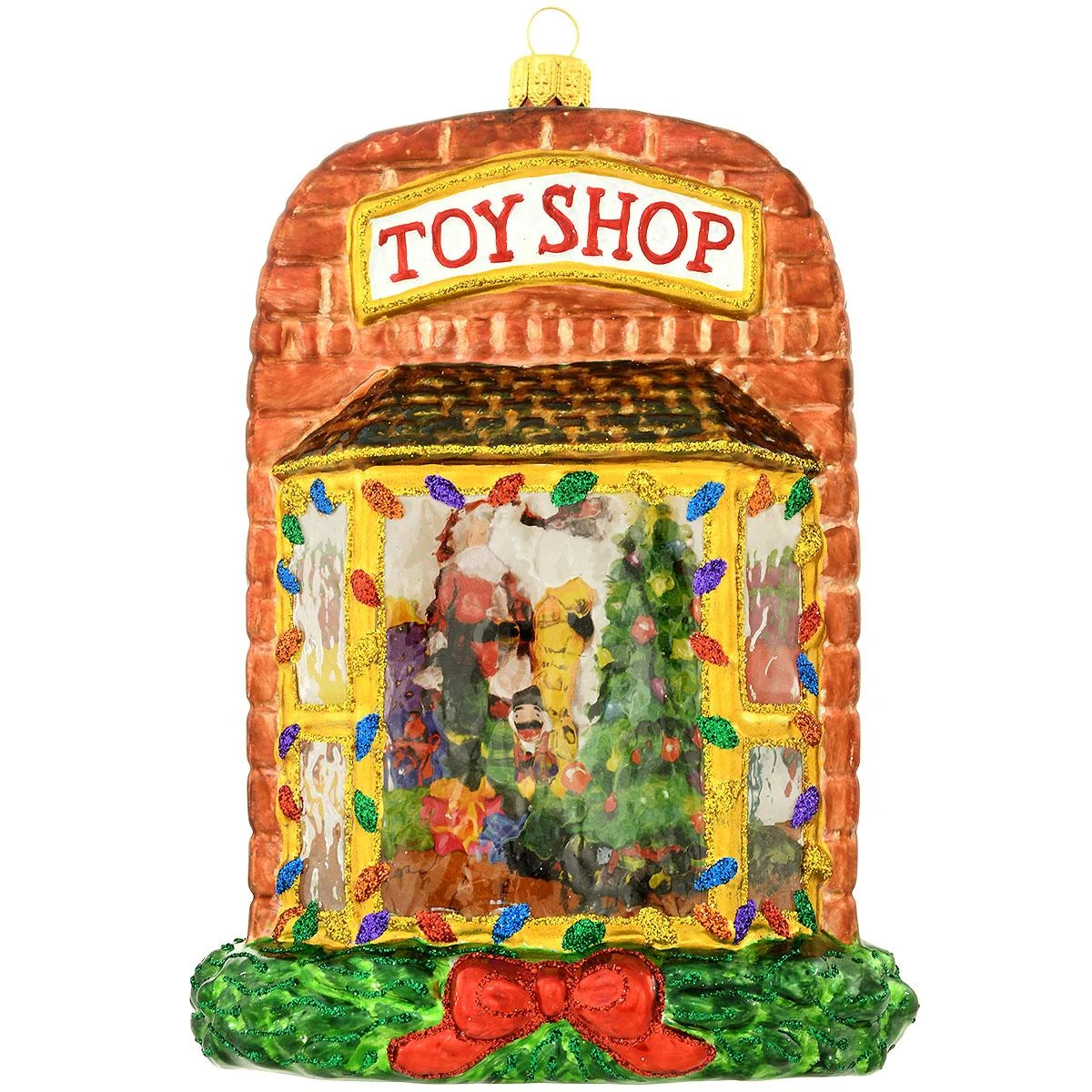 Peer through the Toy Shop store window and catch a glimpse of St. Nick choosing special toys for the “nice” girls and boys on his list. With multi-colored Christmas lights and festive decorations adorning Santa’s Toy Shop’s “brick” façade, this Bronner’s exclusive form ornament measures 5½” tall x 4¼” wide and is based on our 2018 annual design by ornament artist Shannon McGinnis. Artfully crafted of glass in Poland with colorful hand-painted glazes and sparkling glitter accents, this enchanting 2018 annual form Santa’s toy shop ornament is sure to be treasured for many holidays to come.