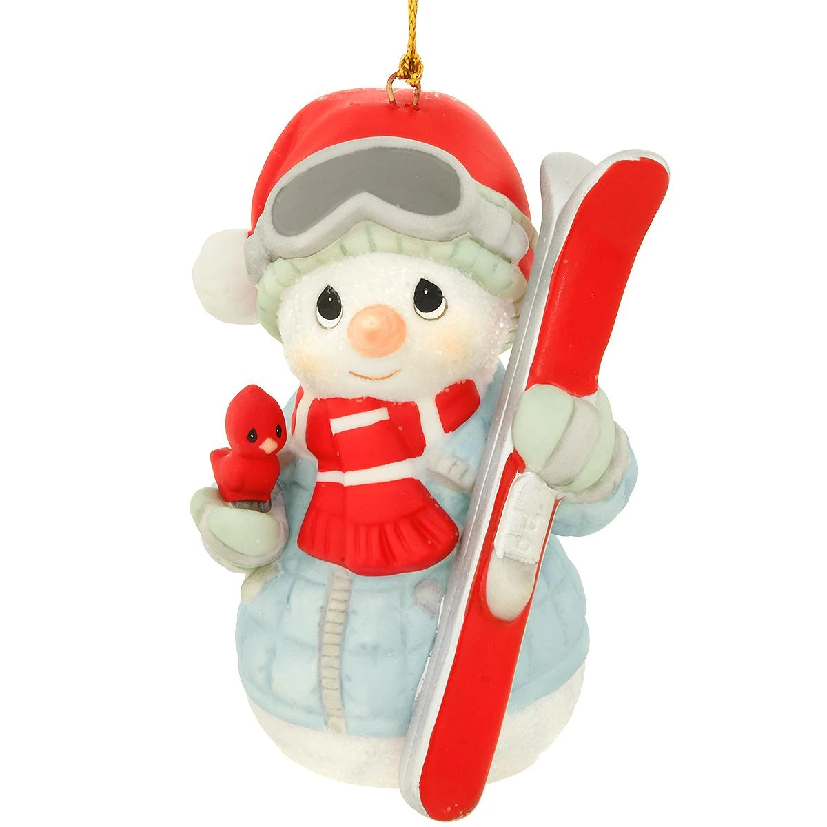 “‘Tis the Ski-son to Be Jolly” features a snowman dressed for the slopes holding skis and a little red cardinal. This adorable precious Moments® 14th annual snowman ornament is expertly crafted from smooth ivory bisque porcelain with vivid hand-painted and glitter accents. 3½” collectible comes ready to hang on a gold cord. Precious Moments® #231016