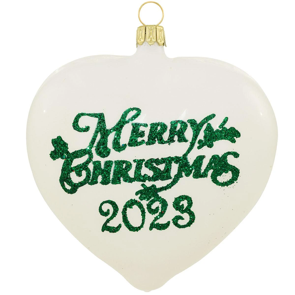 “Merry Christmas 2023″ adorns our shiny white heart in a flourish of dazzling green glitter. A heartfelt gift for friends and family, this commemorative ornament is skillfully crafted of glass and measures 3¾” tall. Made in Germany.