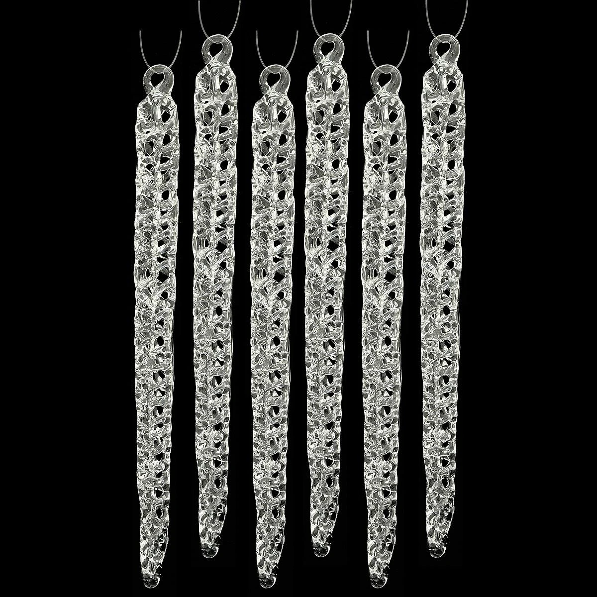 Shimmering icicles on the tree bring winter’s thrill without the chill! Crafted of spun glass, each crystal clear icicle in this dazzling set of 6 measures 6″ tall and comes ready to hang on a monofilament line. Your holiday décor will look especially n-ice all decked out with the texture and shine of these gorgeous icicles!
