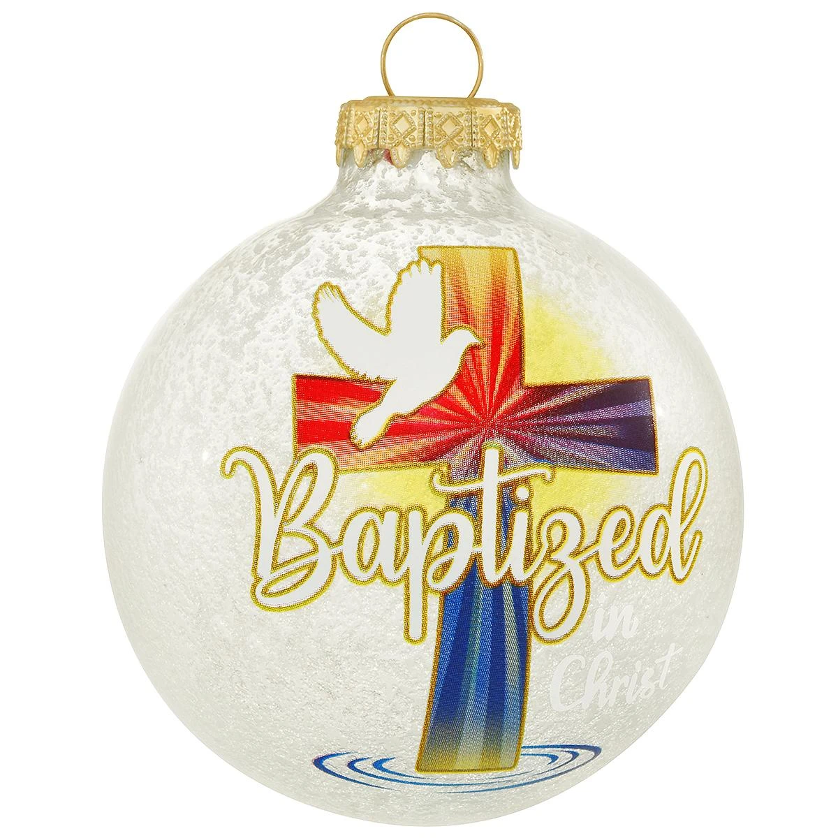 Rejoice in the sacred occasion of a christening or personal choice to be “Baptized In Christ” with this unique 3″ ornament. Artfully crafted of glass in Hungary exclusively for Bronner’s, this distinctive ornament features a shimmering “rain glitter” interior with a depiction of a cross, dove, and baptismal sentiment that reads Baptized in Christ printed on the front.