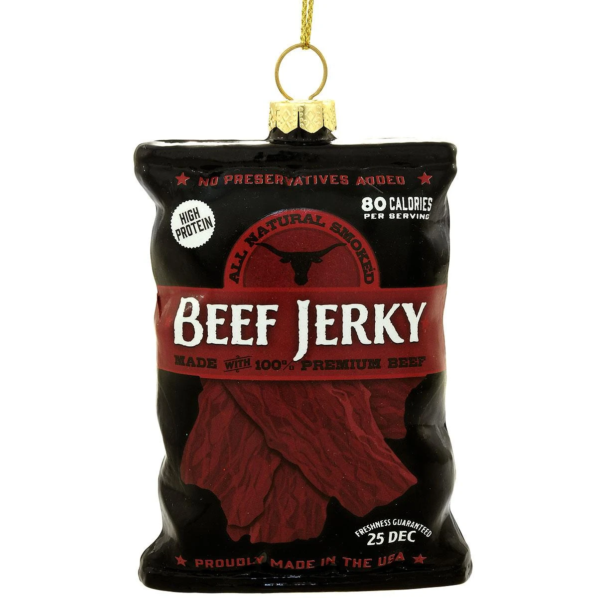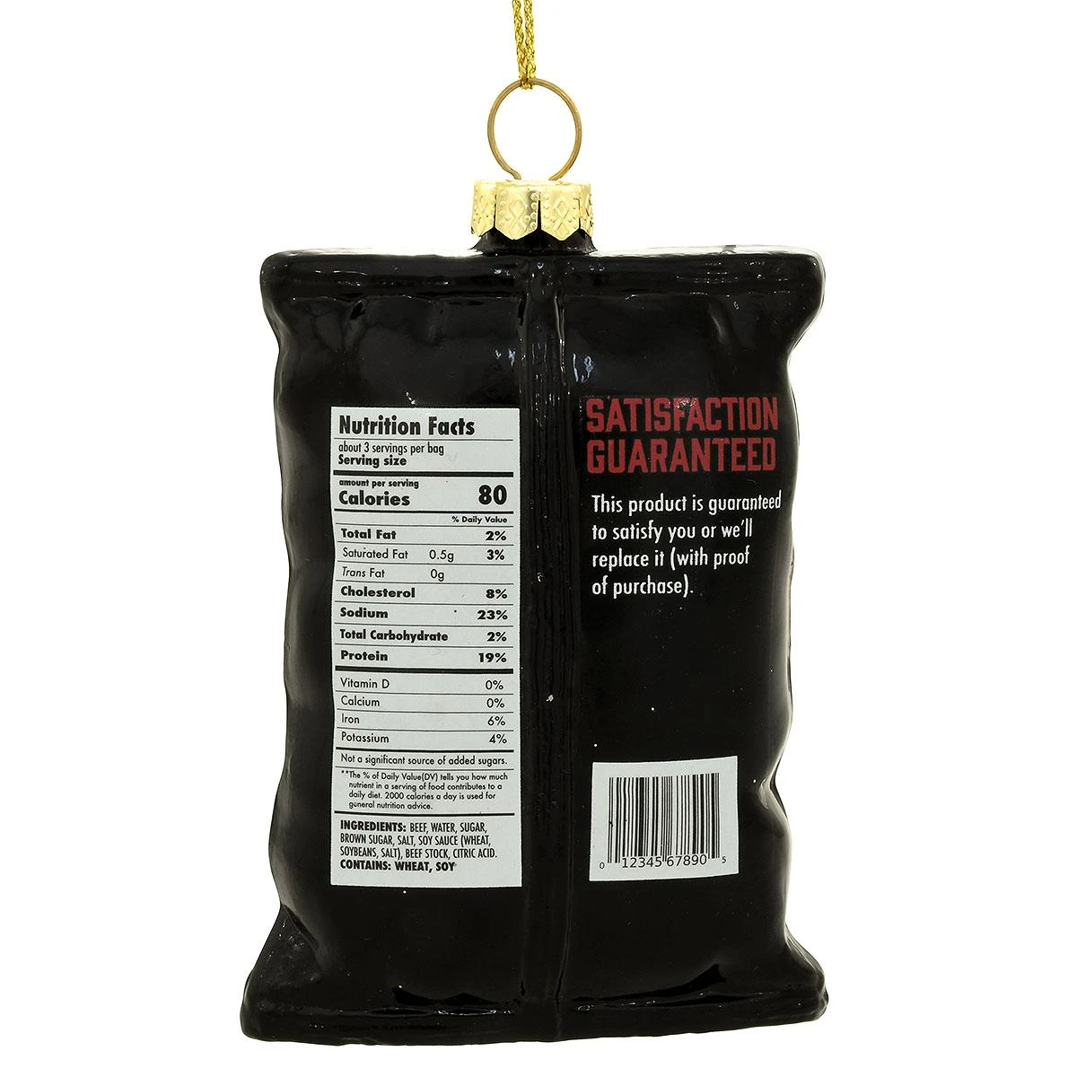 Beef lovers unite … and feast your eyes on this mouthwatering favorite! Crafted of glass, our bag of beef jerky looks just like the real thing—it from front to back. The whole family will enjoy this unique food themed keepsake which measures 3½” ornament and comes ready to hang on a gold cord.