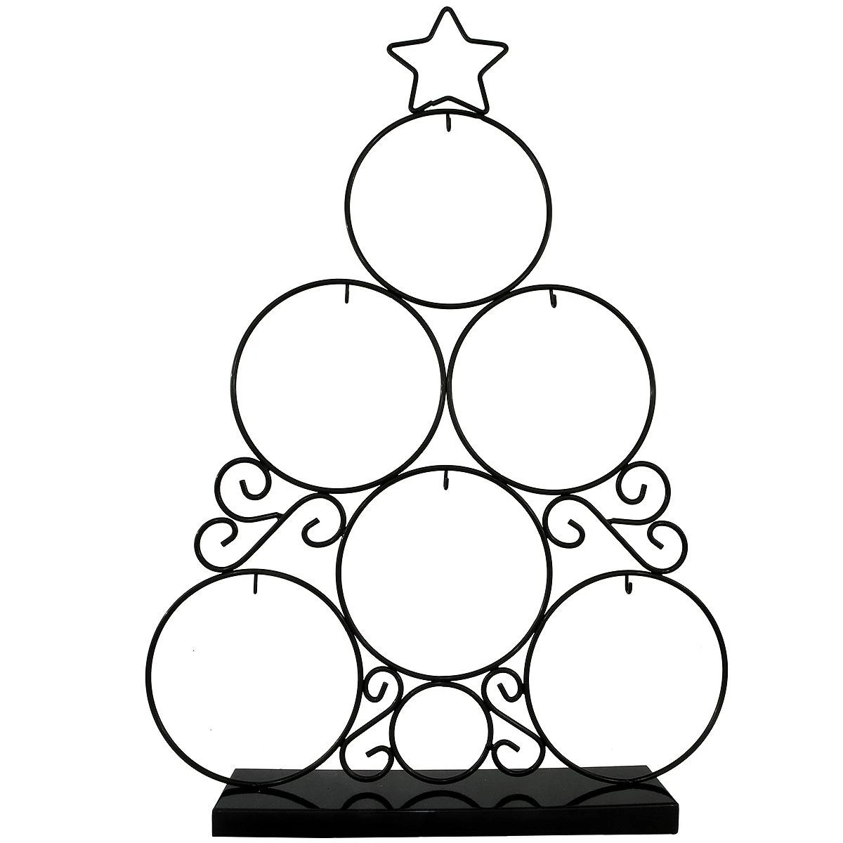 Artfully crafted of metal with a glossy black finish, this Bronner’s exclusive display stand is designed to showcase six of your favorite ornaments. With an imaginative Christmas tree shape complete with star on top, our elegant 19¼” tall x 13½” wide x 2½” deep black display stand features six circular areas equipped with inconspicuous hooks ideal for displaying ornaments up to 3″ tall.
