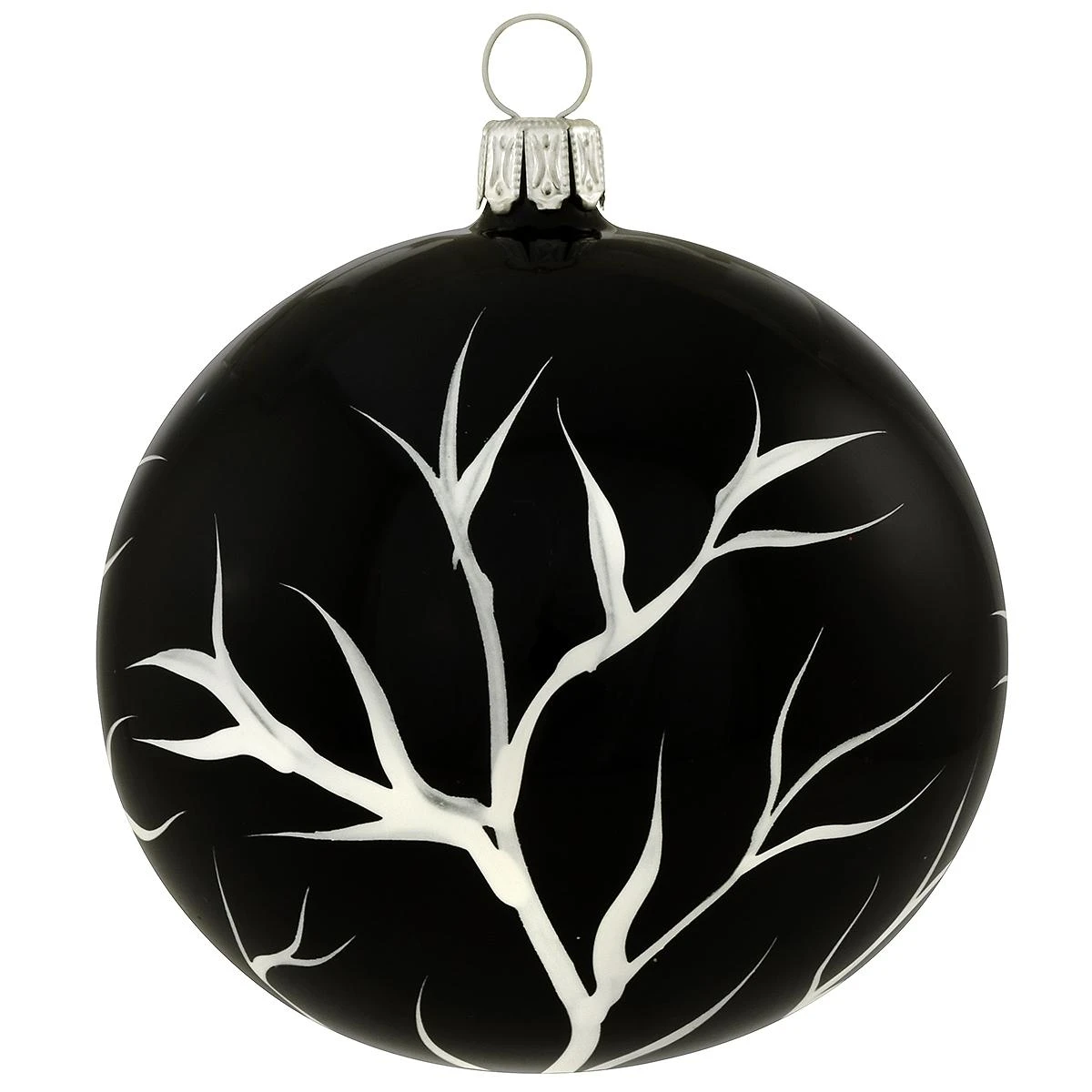 Simply stunning in black in white, this elegant glass design features bare white tree branches against a backdrop of shimmering ebony. Expertly hand-crafted and hand-painted in Germany, this eye-catching ornament measures approximately 3″ tall.Â