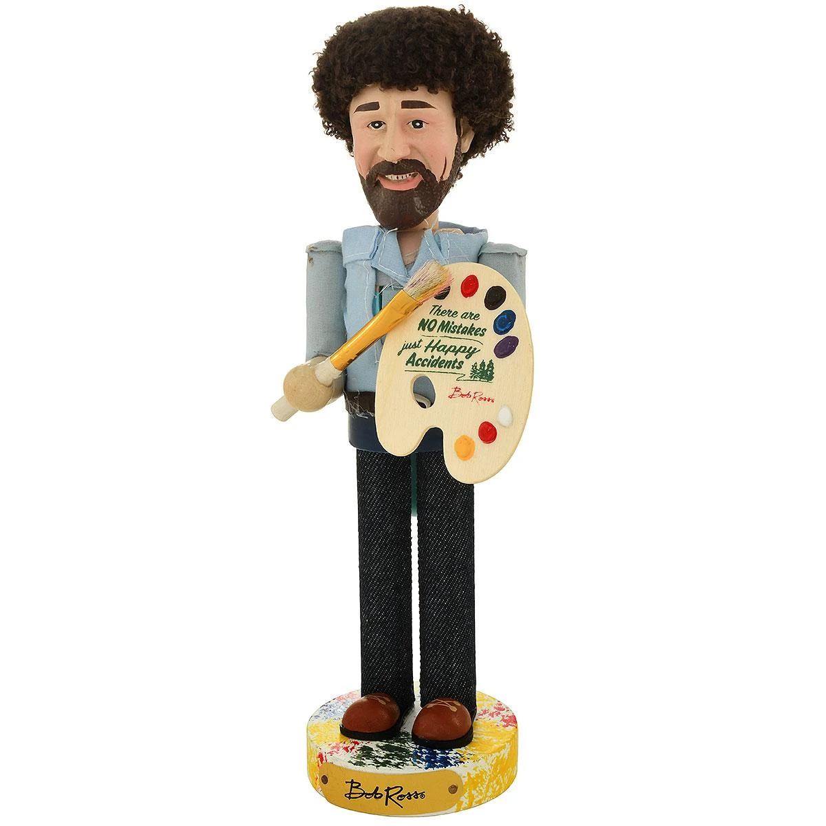 A Bob Ross with palette in tribute to your palete, but you won’t want to crack nuts with this collectible nutcracker! From his curly, signature afro made of yarn, to his denim jeans and button up top, this 10″ Bob Ross nutcracker features textile accents for a playfully “realistic” appeal. You’re favorite Bob Ross fan is sure to adore every detail, from a brush in hand and painter’s palette showcasing his trademark phrase “There are no mistakes just happy accidents” to the paint splattered base with name plate. The “Joy Of Painting” artist is sure to bring the joy of Christmas! Features a lever that moves up and down in true, nutcracker-like fashion. Â