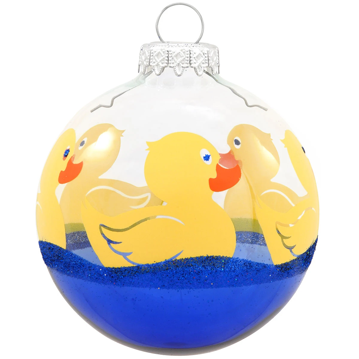 Rubber ducky, you’re the one….you make Christmas so much fun! Artfully crafted in Hungary exclusively for Bronner’s, this whimsical 3″ round transparent glass ornament depicts a row of yellow rubber ducks bobbing on gentle waves of shimmering blue glitter. It’s just ducky!