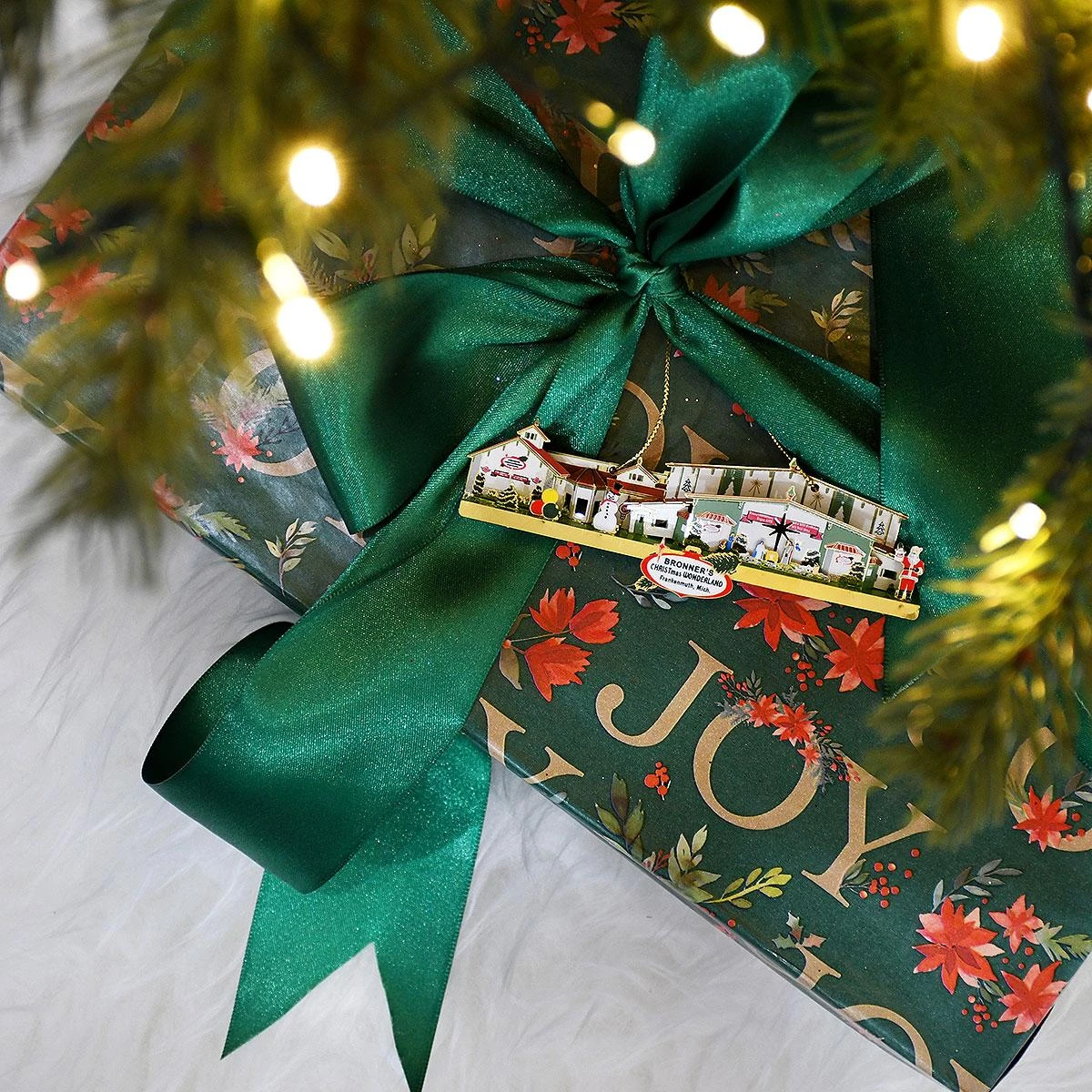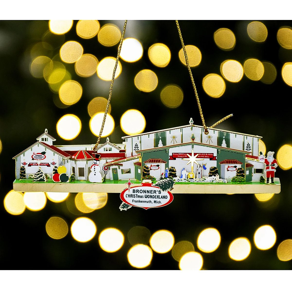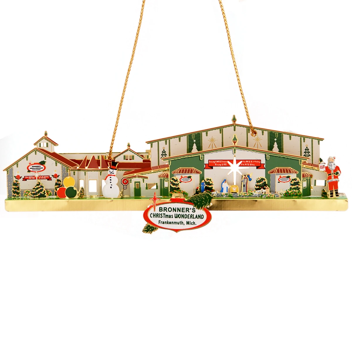 Celebrate the magical store that keeps Christmas alive all year long with this unique Bronner’s souvenir! Incredibly detailed in genuine solid brass with vibrant enamel accents, our stunning 3-dimensional ornament depicts an exterior view of the Bronner’s building complete with nativity scene, Santa, and snowman. Adorned with Bronner’s CHRISTmas WONDERLAND’s iconic red and white ornament logo, this 1½” tall x 4½” wide ornament comes ready to hang with a gold cord and is sure to be cherished for many seasons to come!