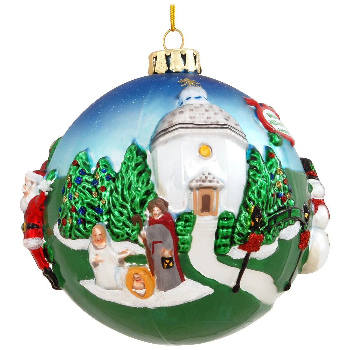 Commemorate a special trip to Bronner’s with this out-standing keepsake! Crafted of glass in amazing relief, our exclusive 4″ tall ornament features a view of the Bronner’s CHRISTmas Wonderland® building and its spectacular nativity scene. Simply stunning from every angle, this vibrant design includes Bronner’s Silent Night Chapel along with our iconic snowman and Santa figures. Shimmering with opalescent glazes and sparkling glitter accents, this special souvenir is sure to be cherished for many seasons to come!
