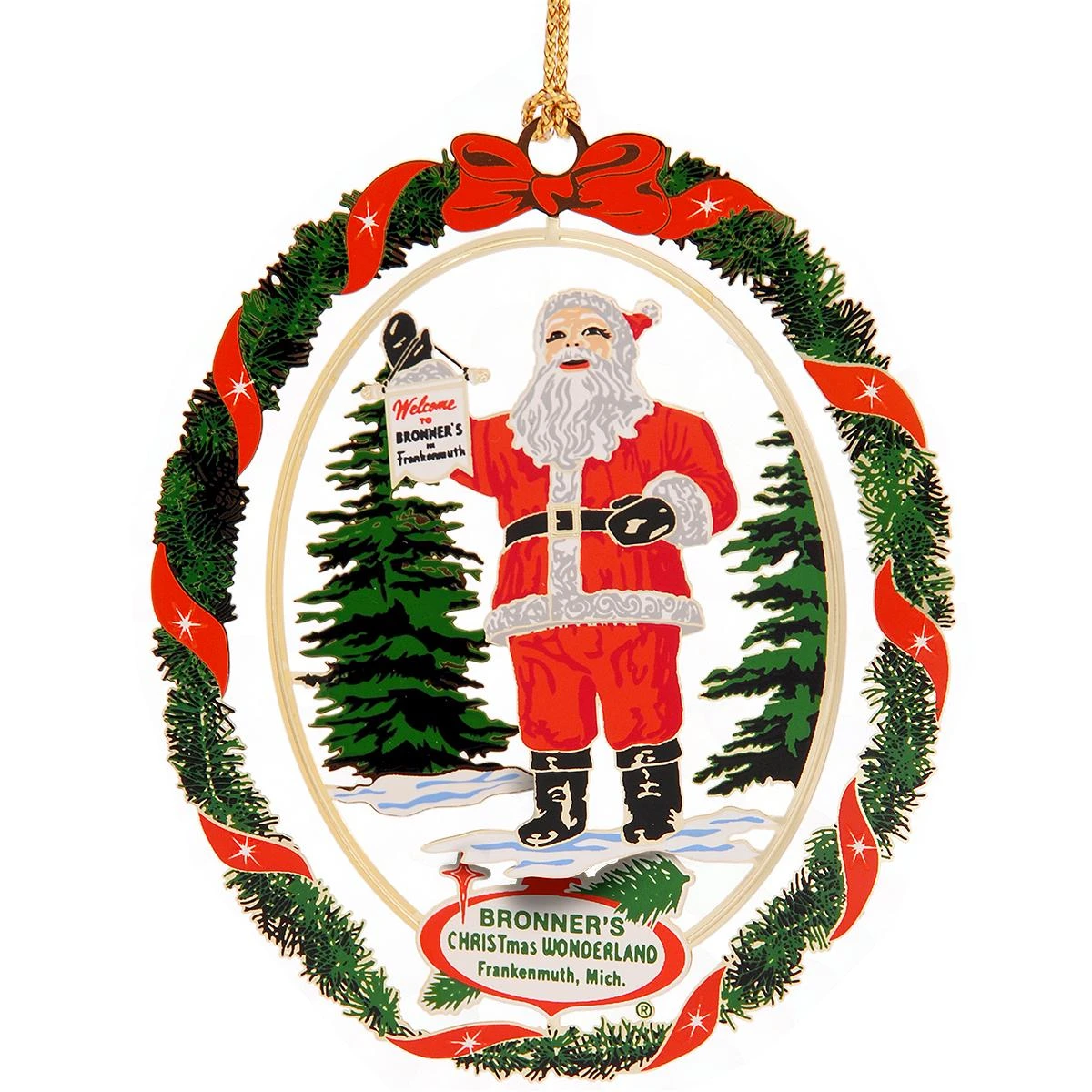 Celebrate the magical store that keeps Christmas alive all year long with this unique Bronner’s souvenir! Incredibly detailed in genuine solid brass with vibrant enamel accents, our stunning 3-dimensional ornament depicts Bronner’s welcoming Santa statue encircled with a Christmas wreath. Adorned with Bronner’s CHRISTmas WONDERLAND’s iconic red and white ornament logo, this 3″ tall oval ornament comes ready to hang with a gold cord and is sure to be cherished for many seasons to come!