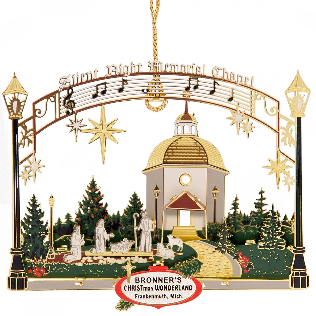 Celebrate your visit to Bronner’s Silent Night Memorial Chapel with this beautiful keepsake ornament! Incredibly detailed in genuine solid brass with vibrant enamel accents, our stunning 3-dimensional ornament depicts the Silent Night Memorial Chapel building complete with a Nativity scene, Christmas trees and arched sign. Adorned with Bronner’s CHRISTmas WONDERLAND’s iconic red and white ornament logo, this 2½” tall ornament comes ready to hang with a gold cord and is sure to be cherished for many seasons to come!