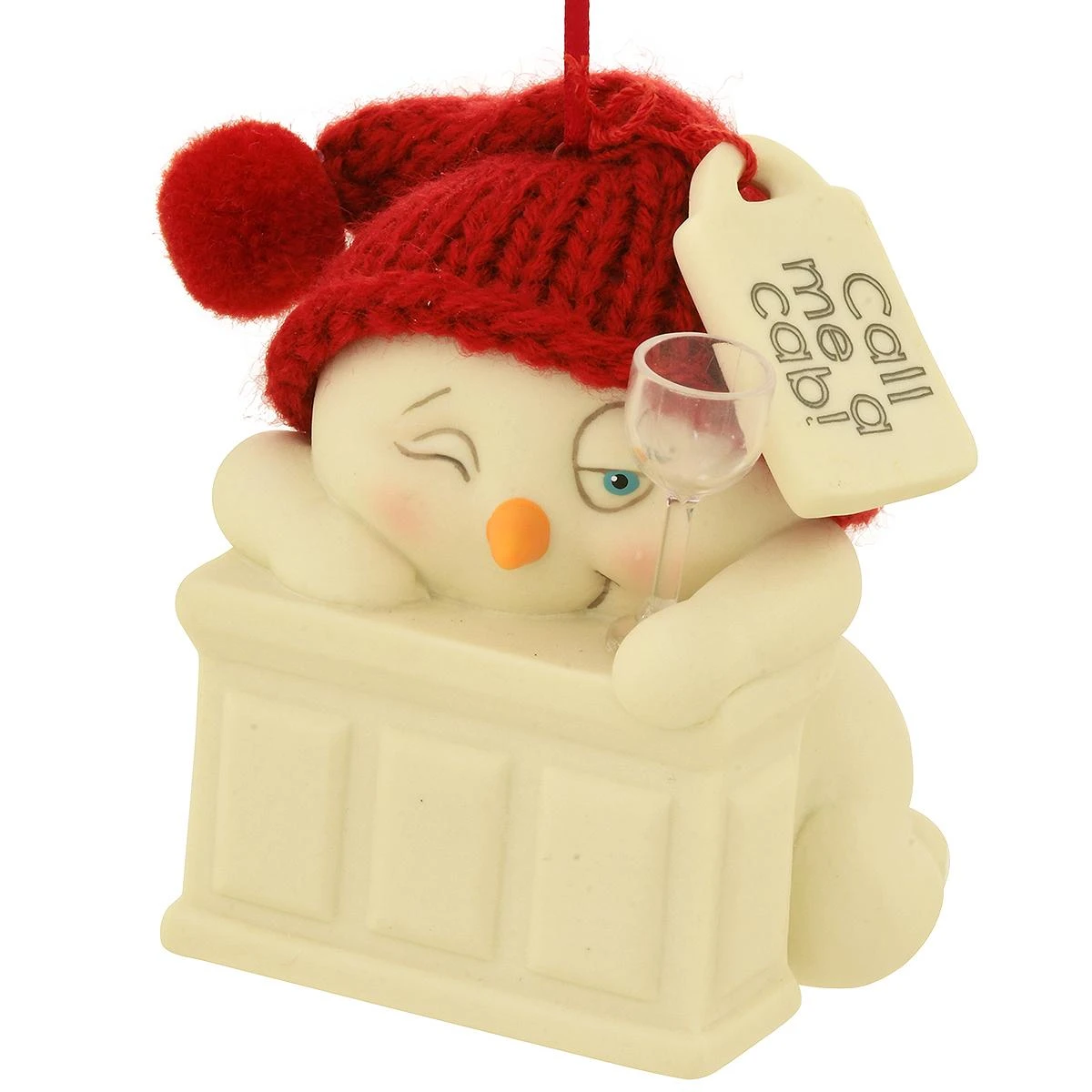 It’s a “Last Call” for this fun Snowpinion who’s having a fine time with wine! Crafted of porcelain bisque with red knit accents, this adorable Snowpinions® ornament comes ready to hang with a red ribbon and measures 2Âľ”. Sentiment tag reads: “Call me a cab!”