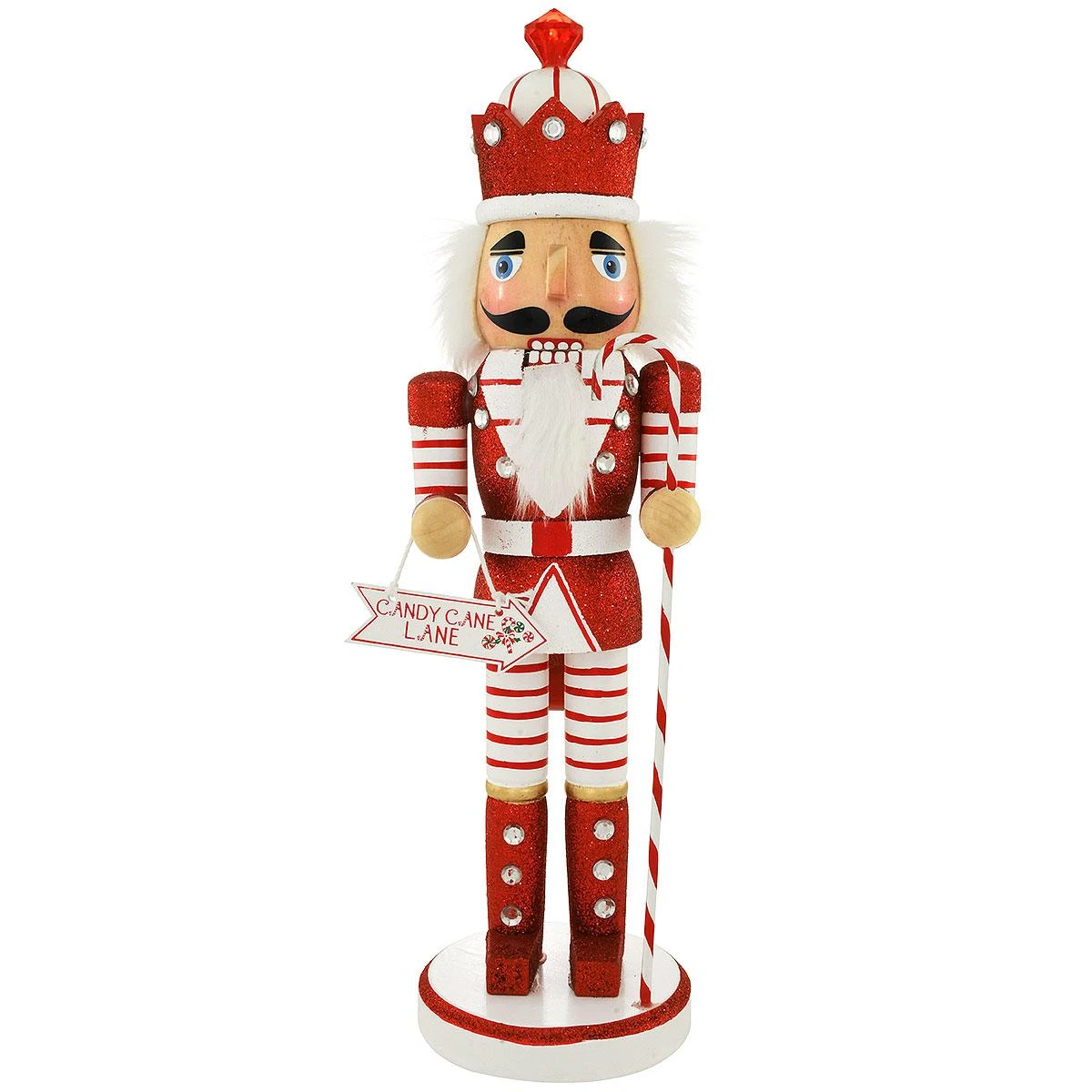 Forget sugar plum dreams and take a stroll down “Candy Cane Lane” with this “sweet” nutcracker! Holding a candy cane staff and sign, our 14″ nutcracker is richly embellished with red and white glazes, dazzling glitter and eye-catching acrylic gems. A lever in back moves his jaw up and down in traditional nutcracker fashion. Crafted of wood with faux fur hair and beard.