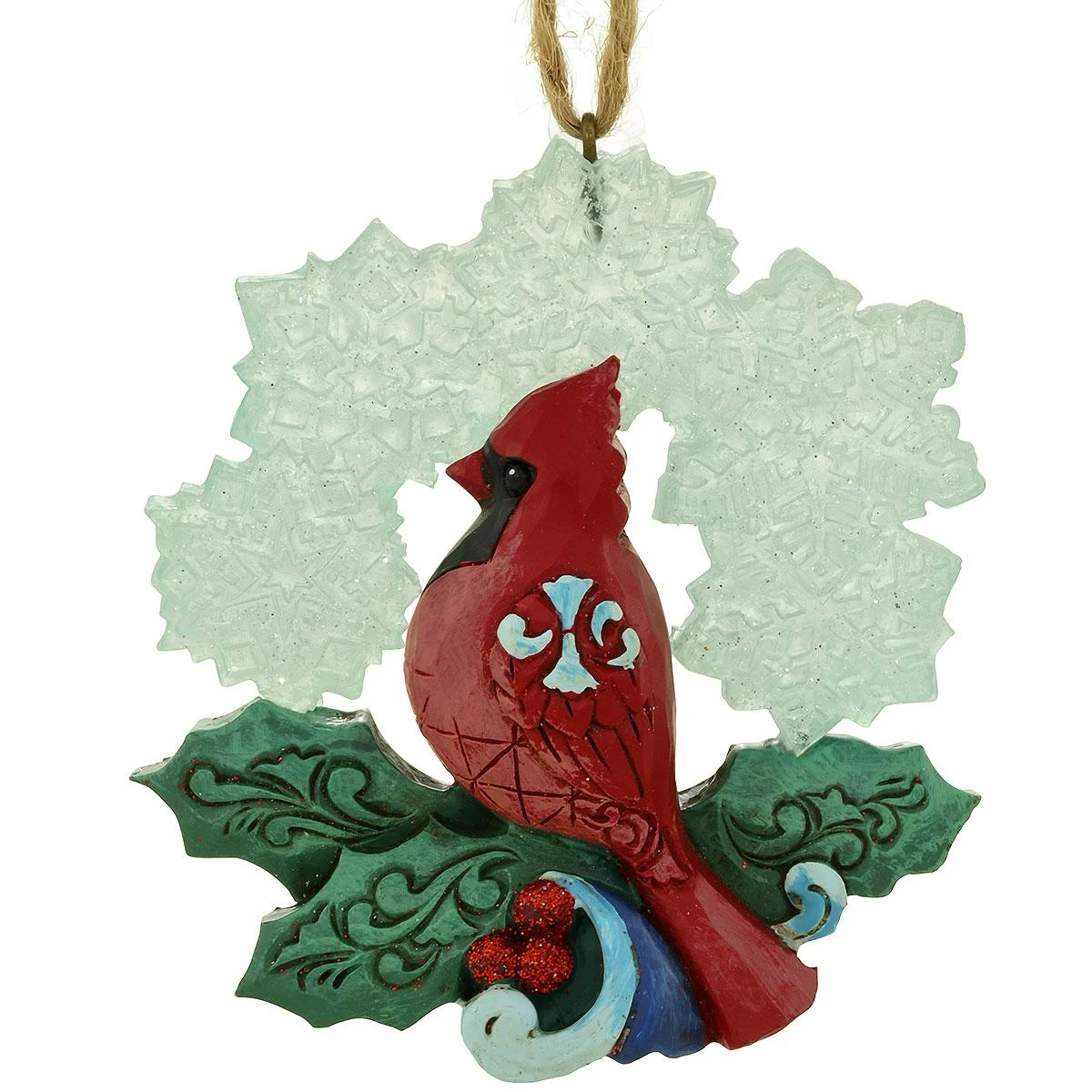 Jim Shore captures, with his remarkable flair, the radiant red bird in all of winter’s delight in this spectacular Heartwood Creek collection wreath design. Perched atop holly leaves with glittering red berries, this beautiful cardinal is elegantly framed by an arch of translucent snowflakes. Coming ready to hang with a jute cord, this Cardinal Snowflake Wonderland ornament measures approximately 3¼” tall.Â