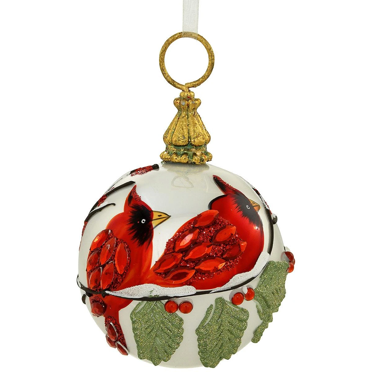 Add unique texture and shine to the tree with these beautiful Christmas birds! Our gorgeous white glass ornament measures approximately 6½” tall (including its decorative gold finial top) and depicts a pair of vibrant red cardinals perched on a branch adorned with sparkling green leaves and berries. Shimmering with dazzling glitter and a variety of eye-catching gems, this striking keepsake makes a bold statement on the tree!