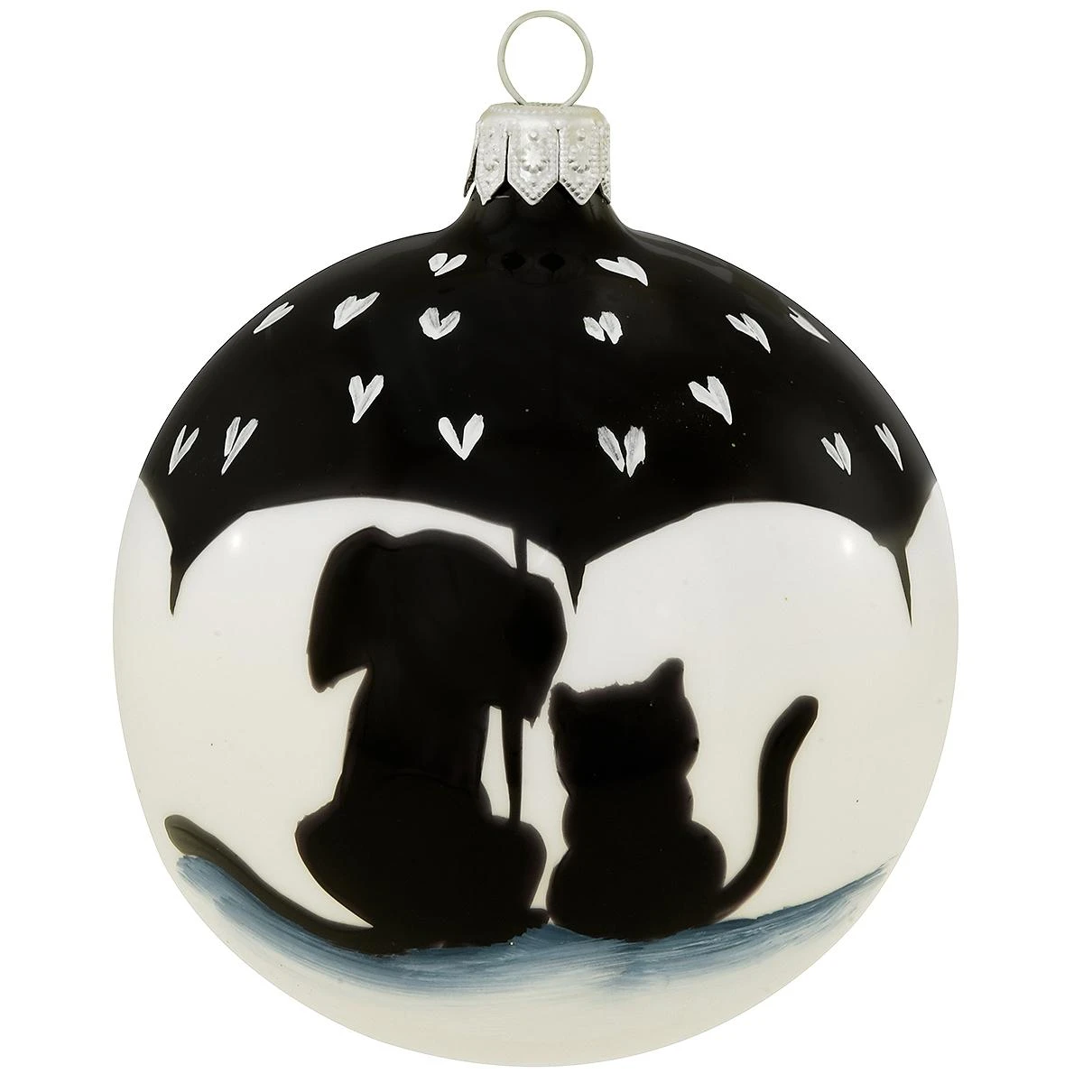 You’ll enjoy this charming Christmas keepsake—whether it’s snowing outside or raining cats and dogs! Crafted of glass in vivid hues of white, black, and blue, 3¼” round ornament depicts two pals—a cat and a dog—huddling under an umbrella sprinkled with hearts. Made in Romania.
