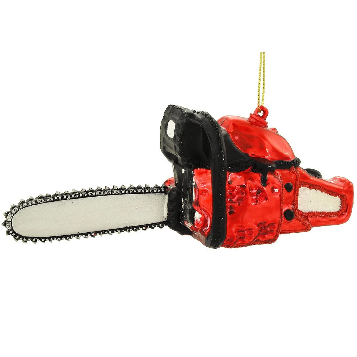 Looking for a cutting edge gift for your favorite lumberjack, arborist or ice carver? You couldn’t “axe” for anything better than this handsome chainsaw ornament skillfully crafted of glass and resin. Coming ready to hang with a gold cord, our red, silver, and black chainsaw ornament shimmers with bright glazes and sparkling glitter accents and measures approximately 2″ tall x 5¼” wide. It just may be the “sharpest” gift your loved one has ever “saw”.