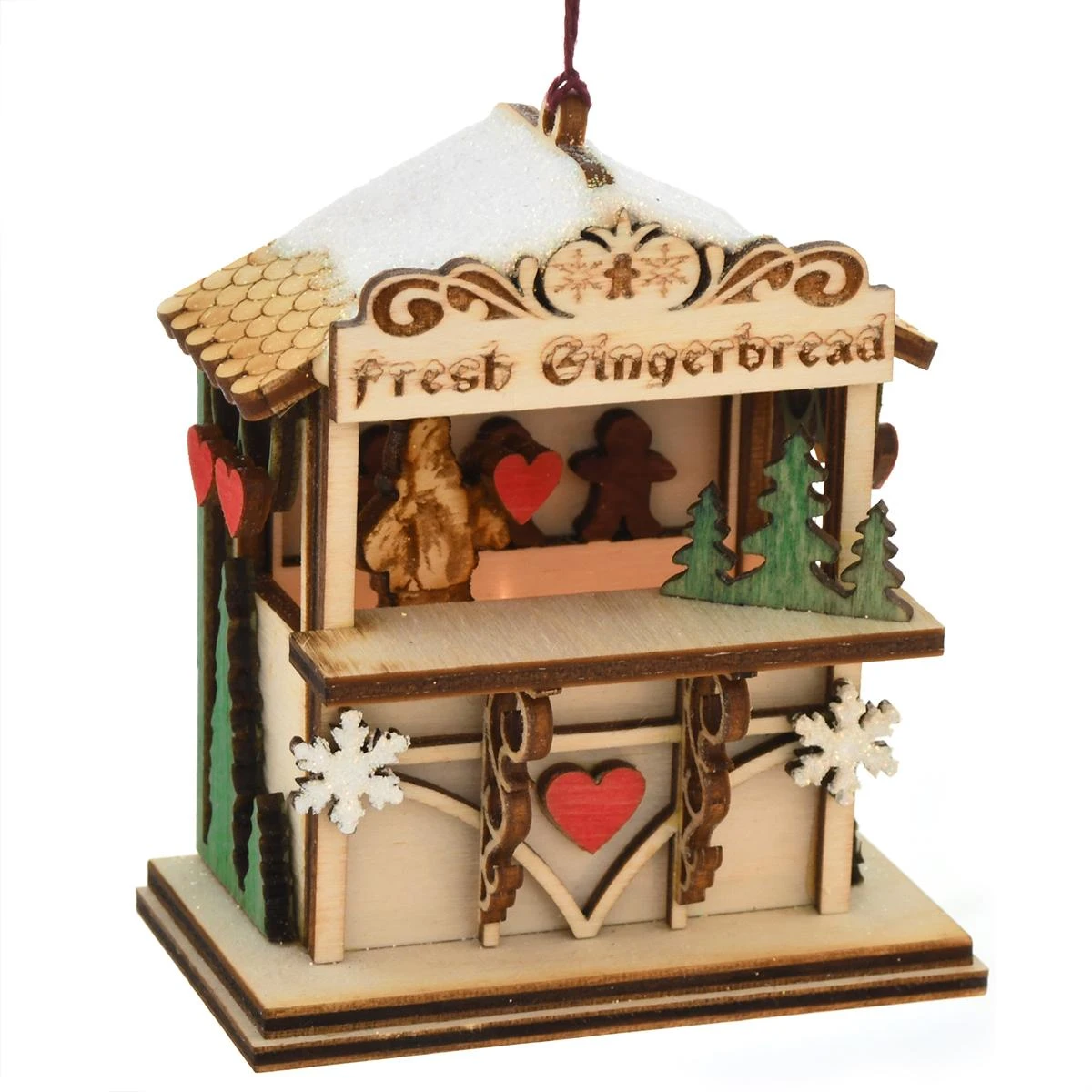 Don’t forget to stop at the Christmas market for some Fresh Gingerbread baked by Santa with love! Artfully crafted of wood and accented with sparkling snowflakes and red hearts, this enchanting Glenn A. Crider Ginger Cottage ornament is specially designed to accommodate a standard mini bulb in the base, which when inserted, illuminates an exhilarating holiday surprise hidden within! This festive 3¼” tall ornament comes ready to hang with a burgundy cord.