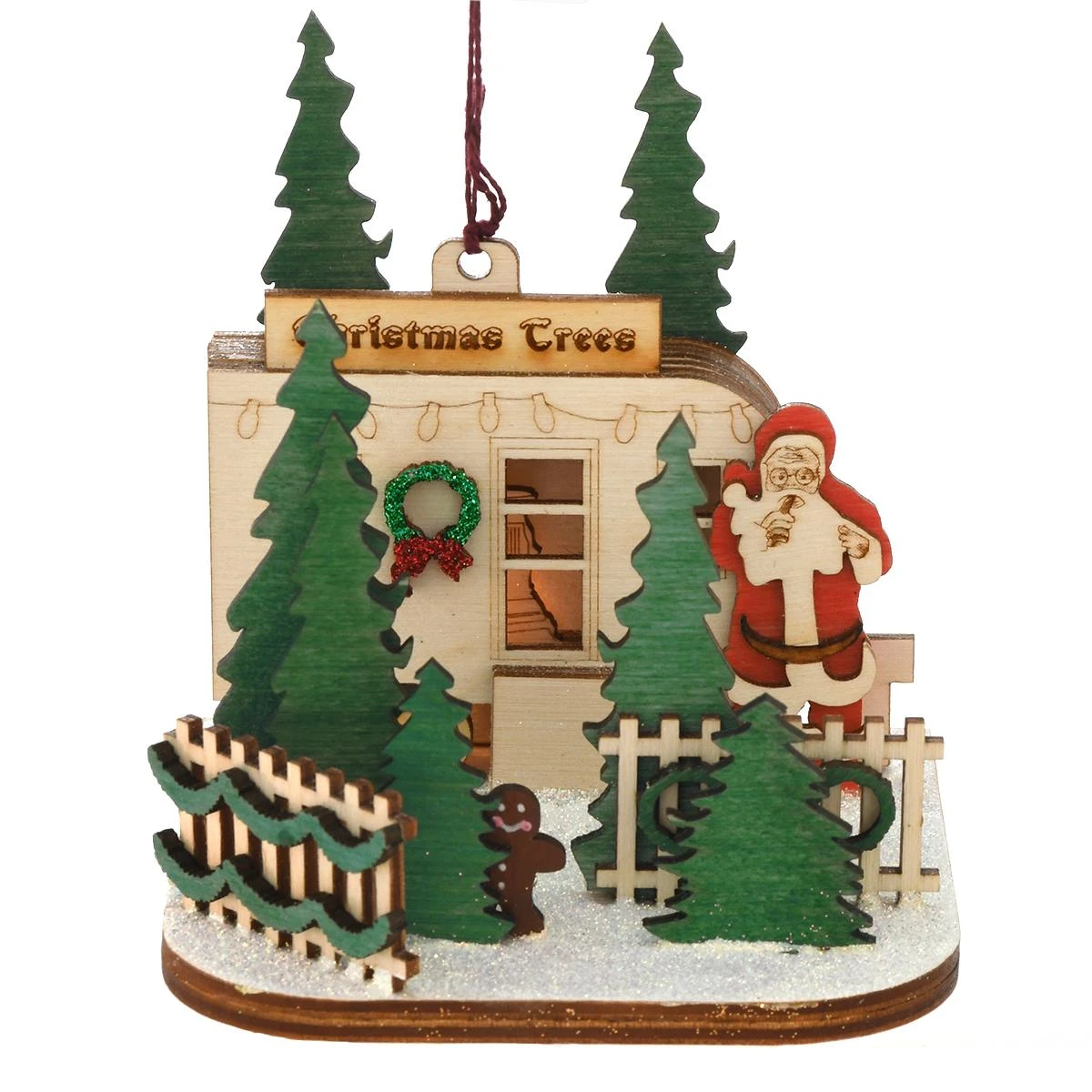 You’re sure to find just the right tree this year at Santa’s Christmas Tree Lot! Smoking his pipe by a little trailer decorated with a wreath and holiday lights, Santa and his gingerbread friend are all set to greet the first customers of the season. Artfully crafted of wood and accented with a “flurry” of sparkling white glitter, this enchanting Glenn A. Crider Ginger Cottage keepsake is specially designed to accommodate a standard mini bulb in the base, which when inserted, illuminates an exhilarating holiday surprise hidden within! This festive 4″ tall ornament comes ready to hang with a burgundy cord.