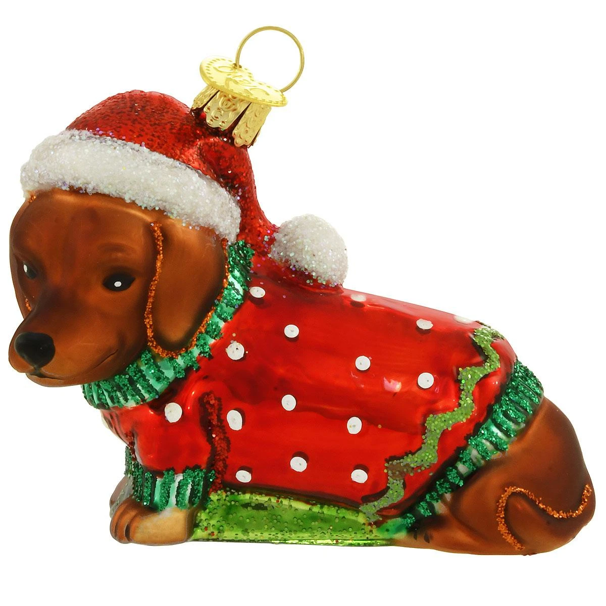 Dressed and ready for Christmas morning, this “Dashing Dachshund” will melt every heart in the room. A dog-gone cute gift for the pet lover on your list, this beautiful glass ornament by Old World Christmas© shimmers delightfully with a myriad of vivid glazes and eye-catching glitter accents and measures approximately 2½” tall x 3 ¼” wide.