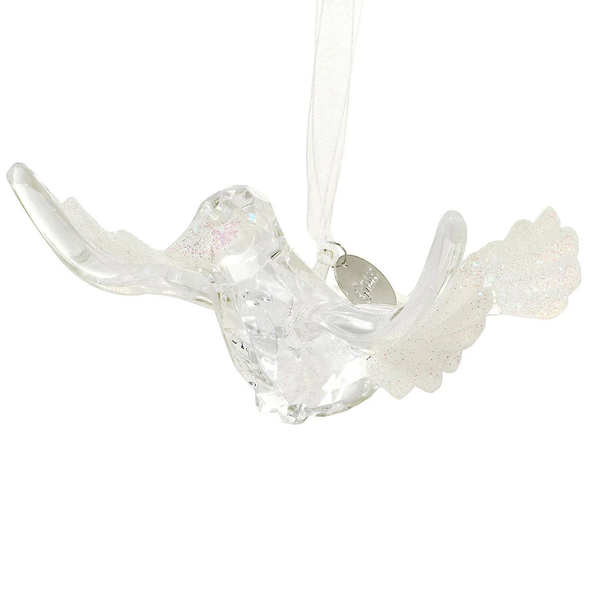 This peaceful dove will add a brilliant shine to your tree or windowpane! Reflecting light with a cut-crystal effect, our beautiful acrylic dove measures 2½” tall and 7″ wide from wing to wing and shimmers with accents of iridescent white glitter. Keepsake comes ready to hang on a white ribbon and includes silver “Grace” charm and “Live Simply” sentiment card with poem which reads: