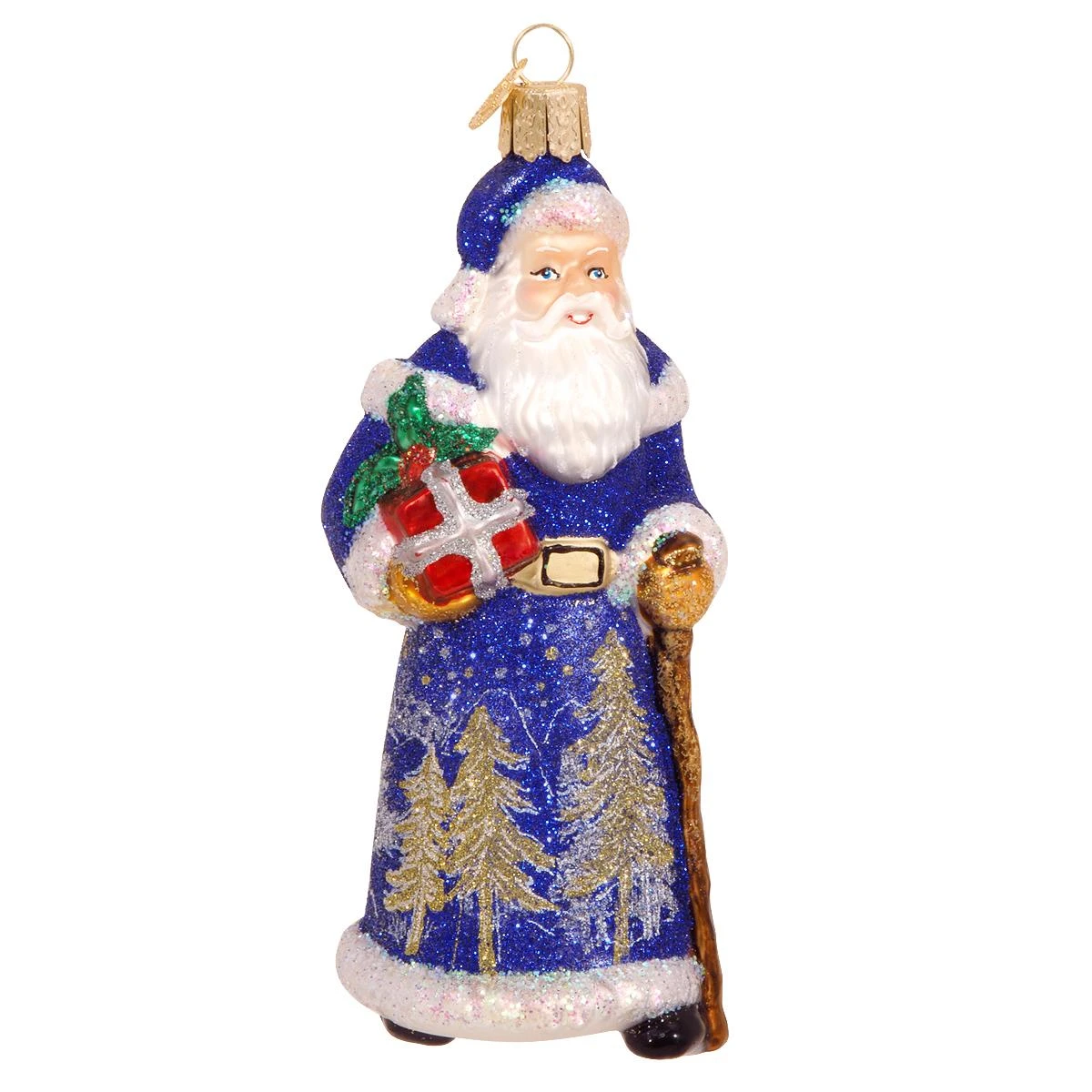Holding a staff and a festively wrapped gift, our 5½” tall Father Christmas ornament is costumed in a full-length midnight blue robe adorned with a majestic fir tree pattern. Glistening with sparkling glitter and crafted of glass from Old World Christmas®, our Victorian-inspired Santa will add shimmering interest to your tree!