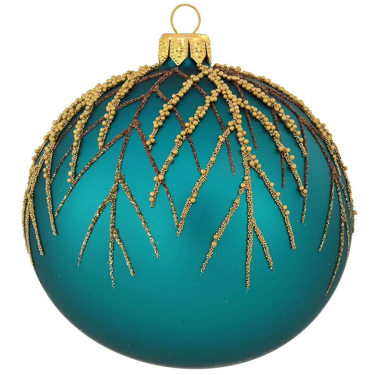 Graceful feather designs branch out from the cap of this radiant 3¾” glass ornament. Shimmering in a lively hue of teal, this unique decoration is embellished with a variety of gold beads and sparkling brown glitter and is sure to be a favorite for many seasons to come. Handcrafted in Poland.Â