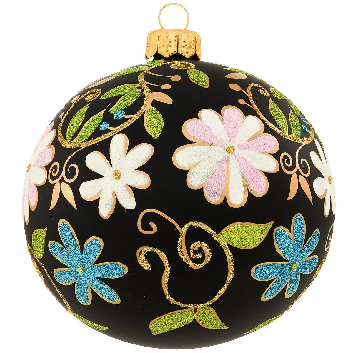 Adorned with gold glazes and colorful glitter blooms, this stunning black ornament is sure to grow more precious every year you plant it on the tree! Hand-crafted of glass in Poland, keepsake measures 3¾” round.