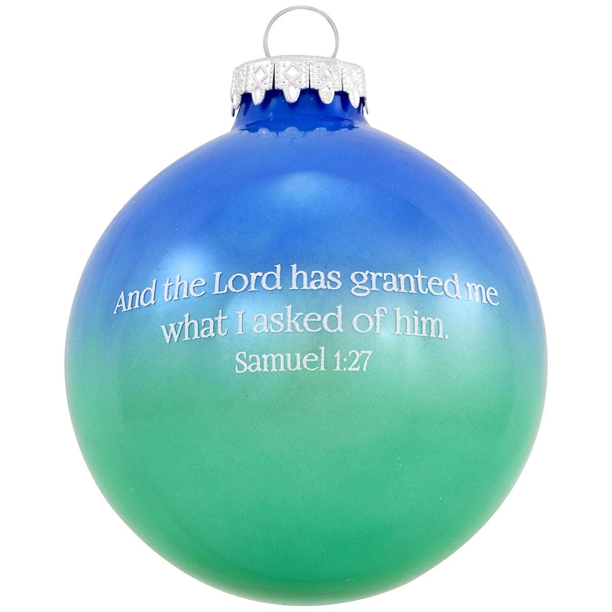A special keepsake for new parents, this beautiful two-tone blue and green ornament depicts an adorable sheep along with the sentiment, For this child I have Prayed. Artfully crafted of glass in Hungary exclusively for Bronner’s, this charming two-sided ornament shimmers with sparkling glitter accents and measures 3″ tall. Reverse side is printed with the Bible verse And the Lord has granted me what I asked of him. Samuel 1:27