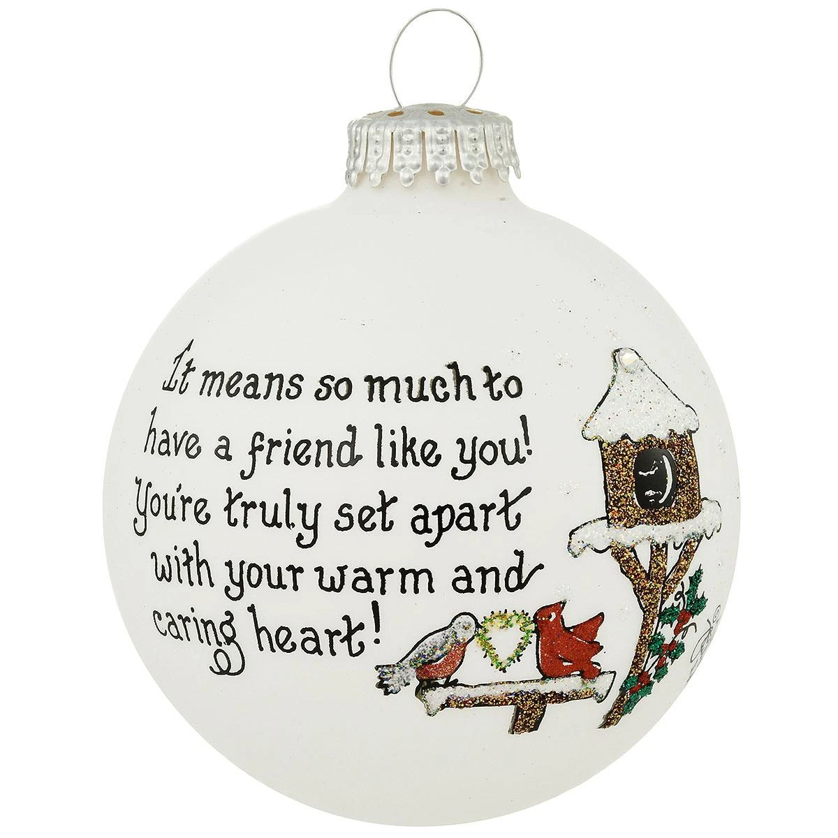 Uniquely crafted with inspired brush strokes and colorful glitter accents, this charming 3¼” glass ornament is perfect for a friend with a caring heart! Depicting a birdhouse with two birds perched happily nearby, this beautiful hand-painted design by Teresa Thibault is embellished with a dazzling Swarovski crystal. Crafted in the USA, this stunning Heart Gifts keepsake comes attractively packaged for safe storage and easy gift giving. Sentiment reads: It means so much to have a friend like you! You’re truly set apart with your warm and caring heart!