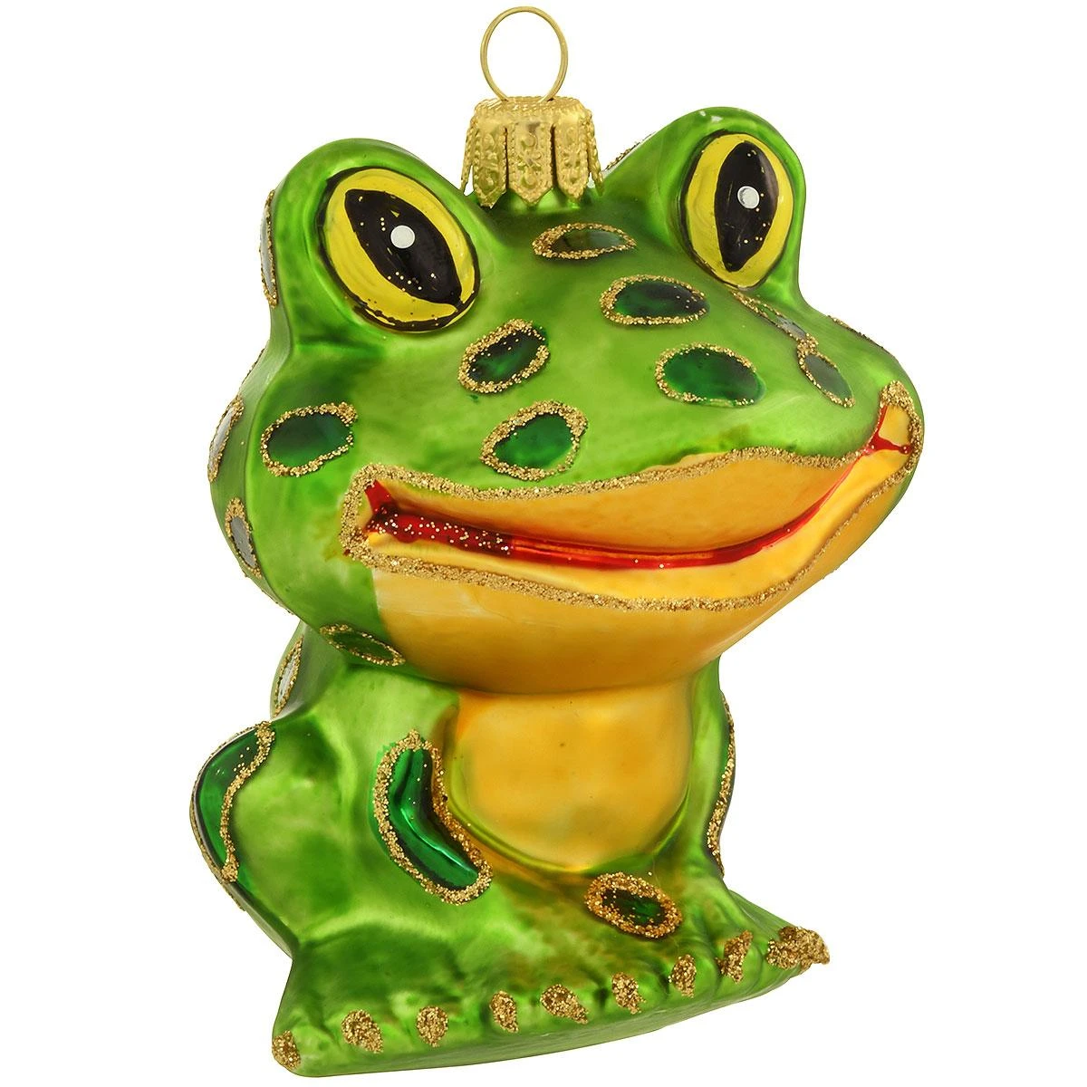 Don’t call him a toad…he’s a hoppy little frog! Grinning from cheek to cheek, our vivid green frog is covered with emerald spots rimmed in dazzling gold glitter. Masterfully crafted of glass in Poland, this charming 3¼” tall ornament is sure to have your animal lover leaping with joy to hang it on the tree!