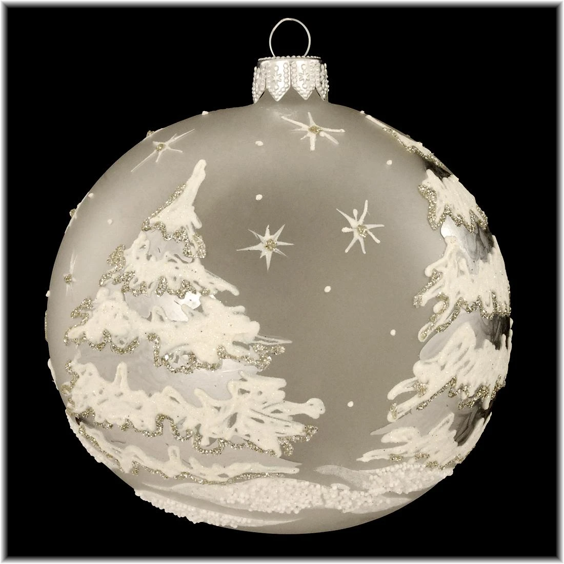 The silver snow-covered trees look hand-painted on the frosted translucent finish of this stunning ornament. Our captivating 4″ glass frost ornament is skillfully crafted in Poland. This traditional-style ornament is sure to look spectacular hanging among the branches of your evergreen tree!