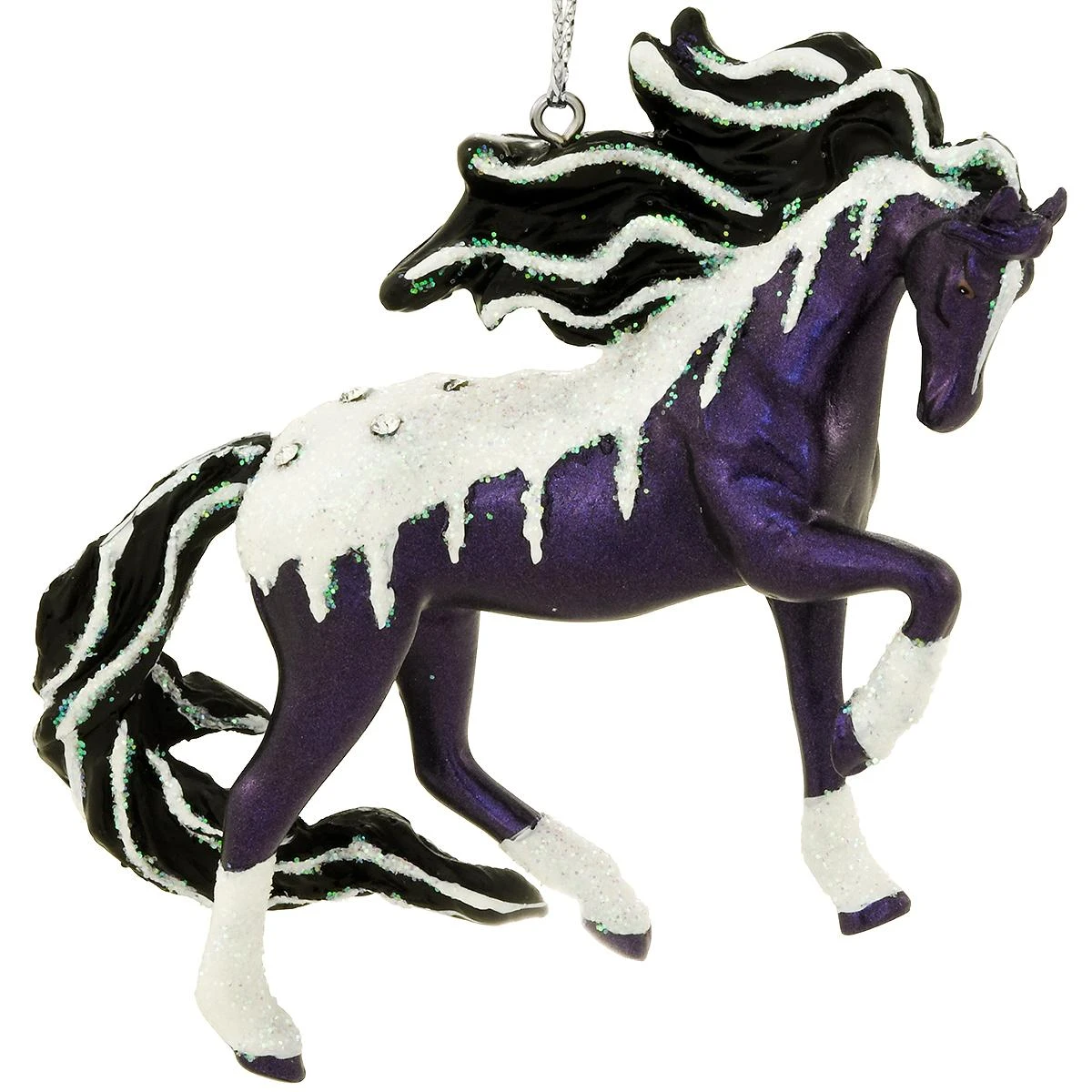 The holidays are the perfect time to parade this triumphant horse on the tree! Resin ornament comes ready to hang on a silver cord and features a dark purple horse with a black main and tail dusted with glittering snow. A tribute to the 20th Anniversary of the Trail of Painted Ponies© series, “Frosted Black Magic” measures approximately 2½” tall x 3½” wide.