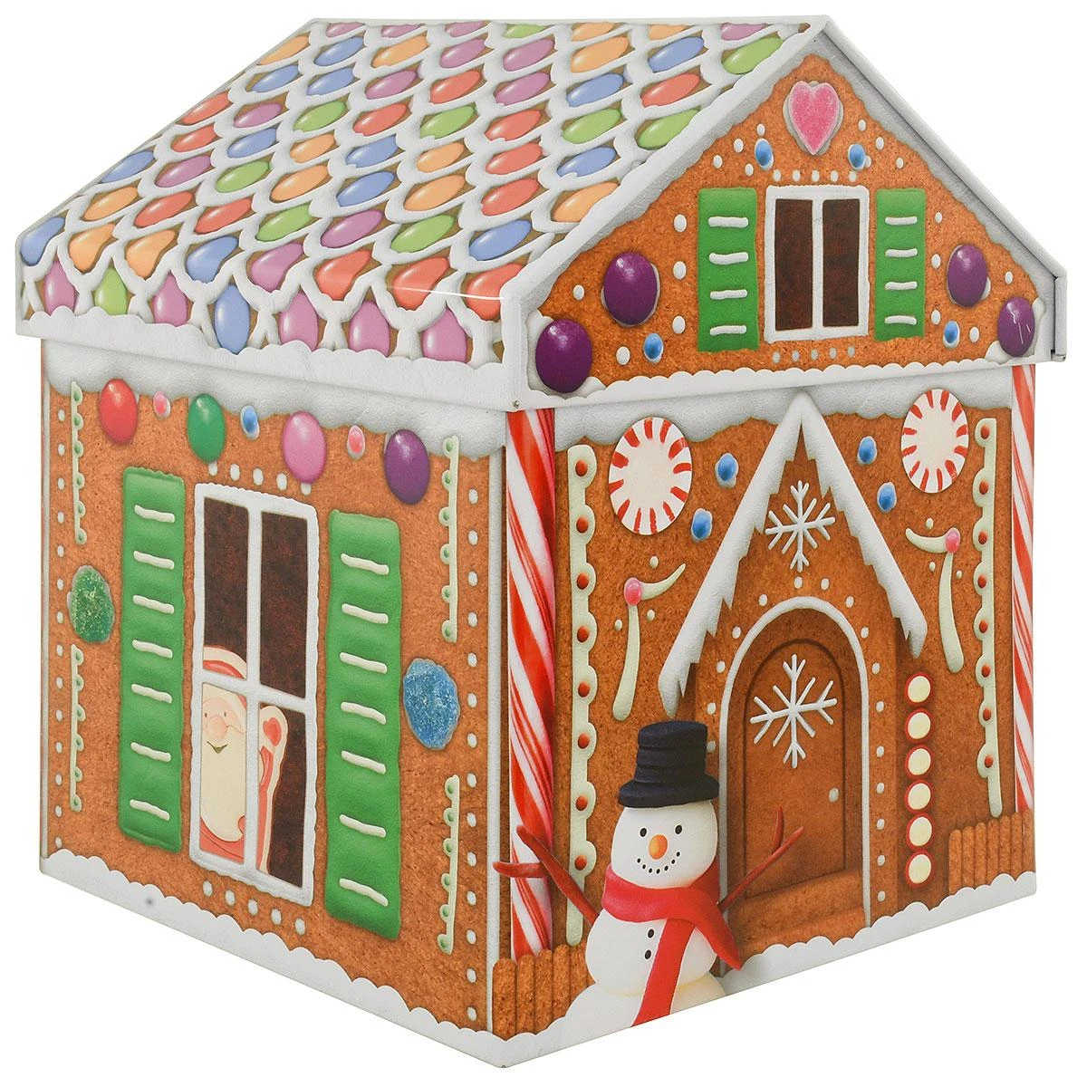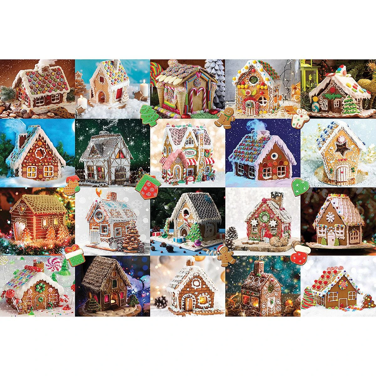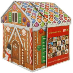 Have fun puzzling out this sweet holiday scene! Image on 550 piece puzzle depicts twenty gingerbread houses lavishly decorated with icing and candies. Set includes collectible gingerbread house tin and poster with puzzle image. Puzzle is made from recycled board paper and printed with vegetable based ink. Tin size: 7½” tall x 6½” wide x 6¼” deep, finished puzzle size: 13″ tall x 19″ wide.