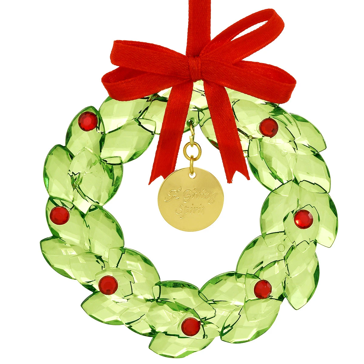 Foster a giving spirit with this festive giving wreath ornament. Crafted of acrylic with the look of cut glass, keepsake features green leaves, red gemstones, and a gold charm engraved with “A Giving Spirit message. Ornament comes ready to hang with a red ribbon and is packaged with a sentiment card and poem.