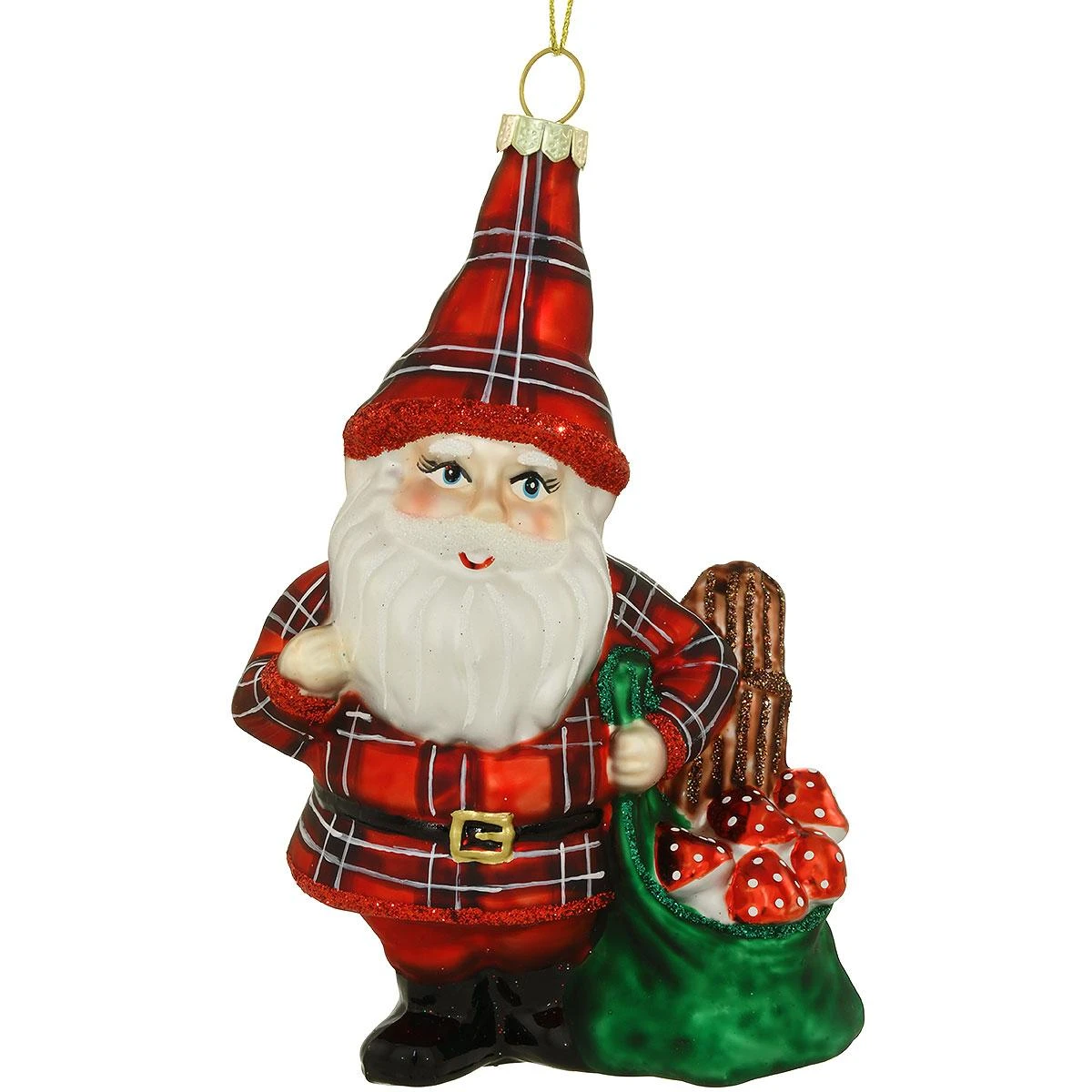 Not all who wander are lost – some are just foraging! This jolly gnome, dressed in plaid, forages in the woods and has filled his sack with an impressive number of toadstools. Painted with festive glazes of red and green, this whimsical 5½” tall glass keepsake shimmers with glittering accents and is sure to please the gnome lover on your list! This ornament comes ready to hang with a gold cord.