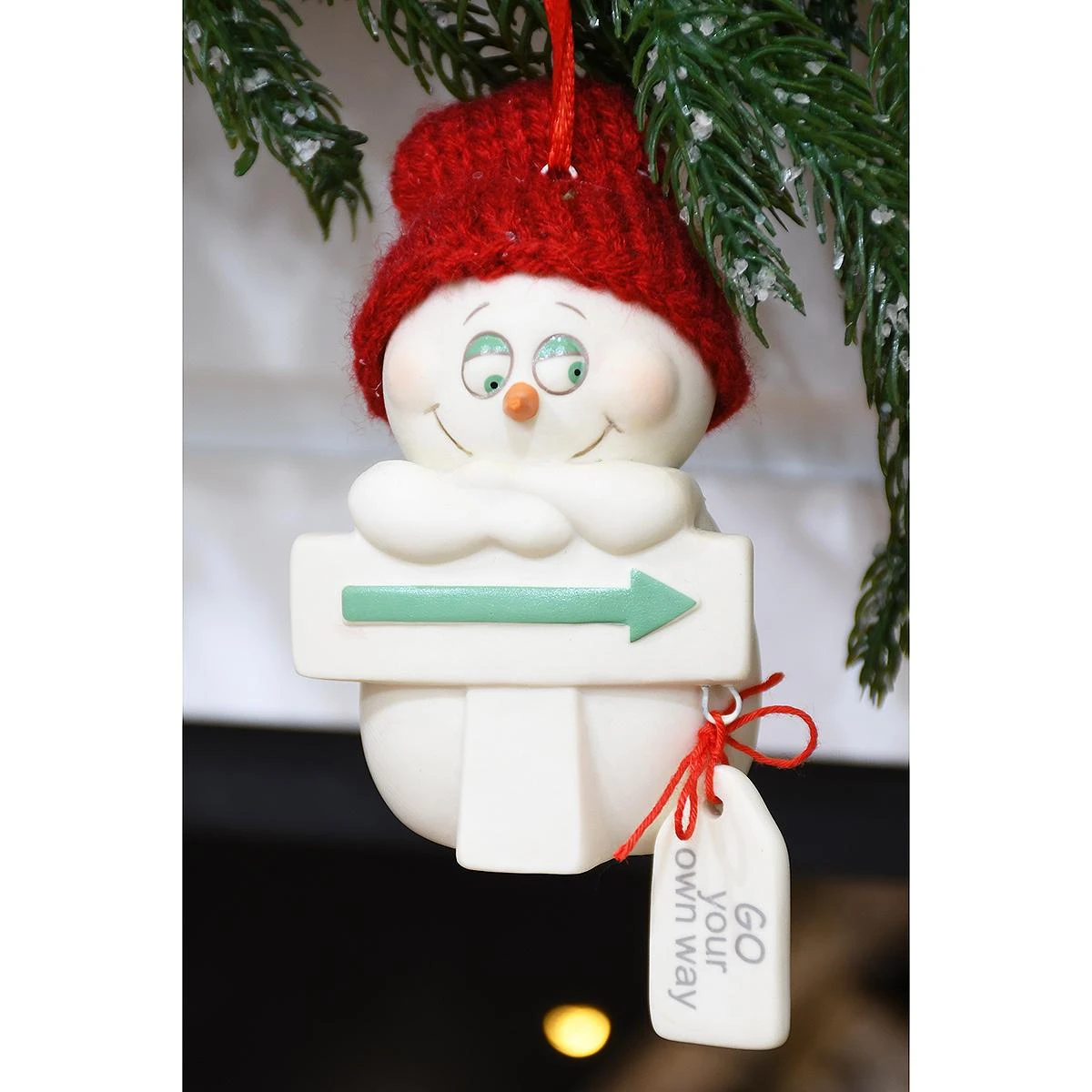 Some people are content to toe the line while others like to forge their own path! Featuring an adorable Snowpinion® with a red knit cap and arrow sign, this delightful “Go your own way” ornament measures 3″. Crafted of porcelain bisque, this ornament comes ready to hang with a white ribbon.Â