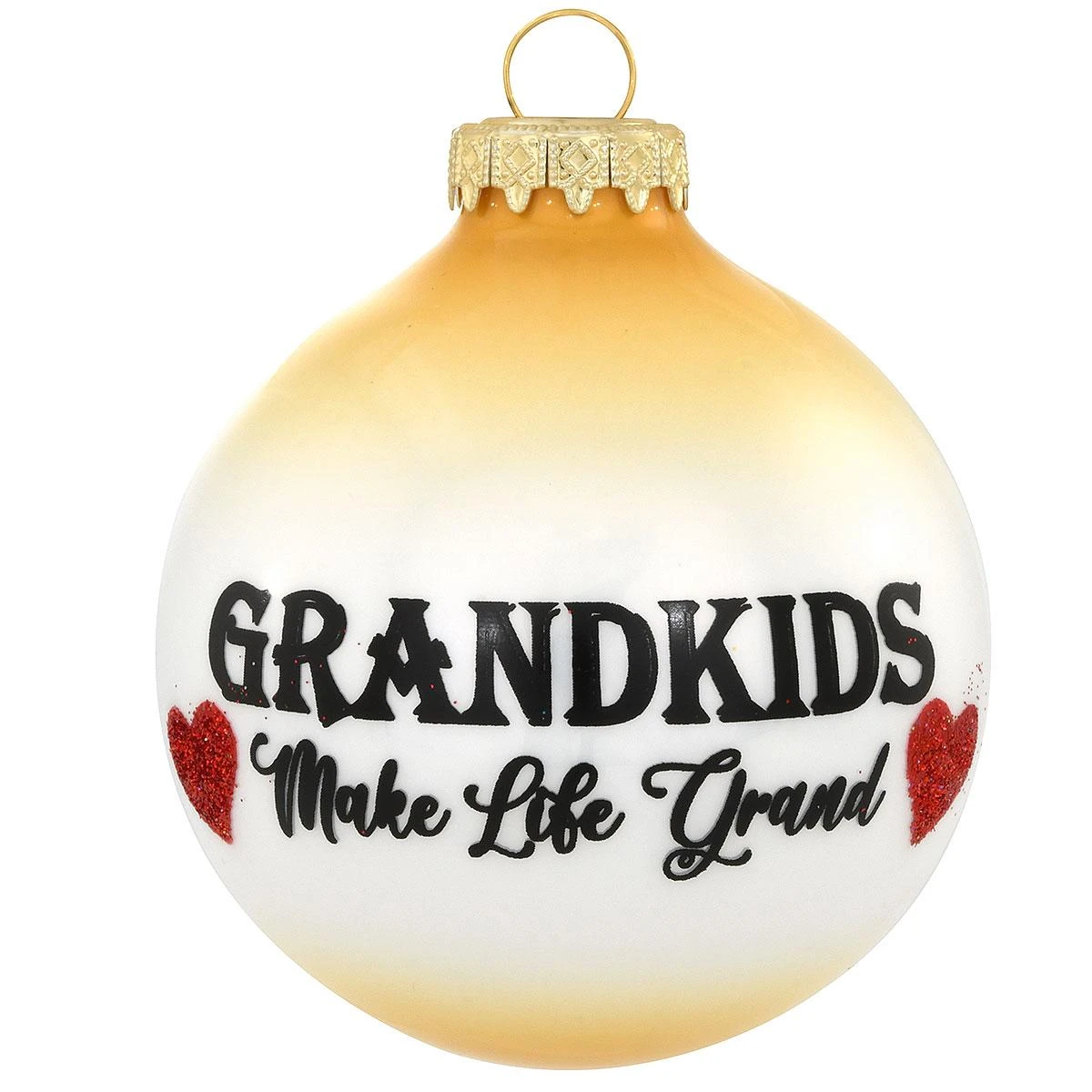One thing grandparents know to be true … Grandkids make life grand! Why not turn your Christmas tree into the “family tree” and celebrate the love of those held dear with this grand keepsake celebrating the special bond between grandparents and grandchildren?! Exclusively crafted for Bronner’s from glass in Hungary, our 3″ round, two-tone gold and white opal ornament features the sweet sentiment framed by two red-glittering hearts. Our endearing Christmas ornament is sure to make the hearts of your grandparents full and the tree look … GRAND!