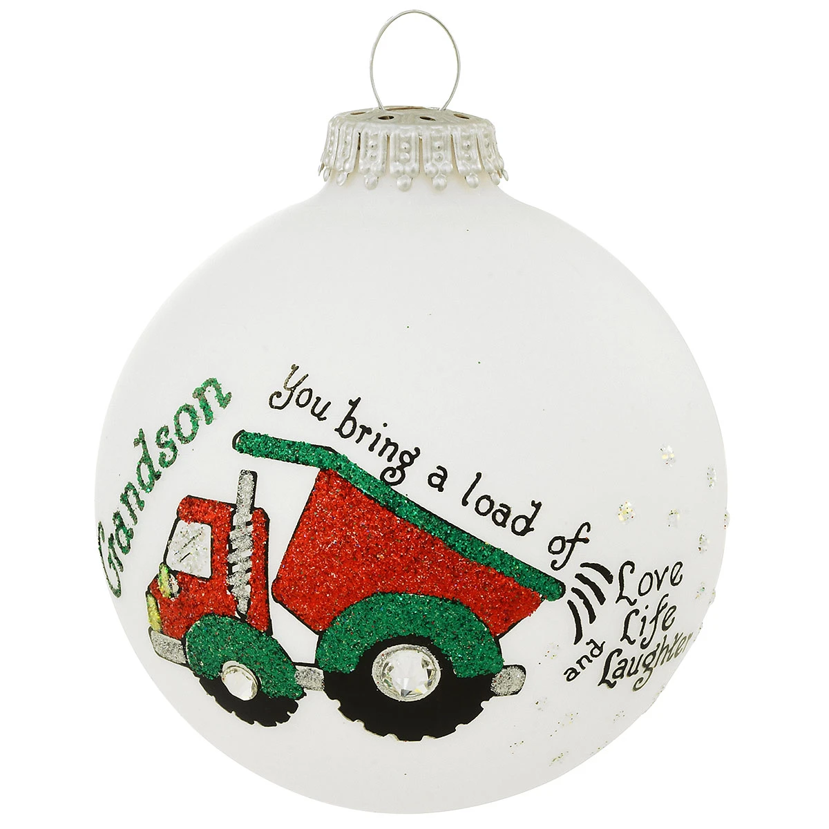 A glittering red and green dump truck unloads a heartfelt sentiment: Grandson you bring a load of love, life, and laughter. Shimmering with sparkling glitter accents and dazzling Swarovski crystals, this handsome Teresa Thibault Heart Giftsâ„¢ design is artfully crafted of glass in the USA. 3¼” tall keepsake comes attractively packaged for safe storage and easy gift giving and is perfect for the grandson who digs construction equipment and spending time with his grandparents!