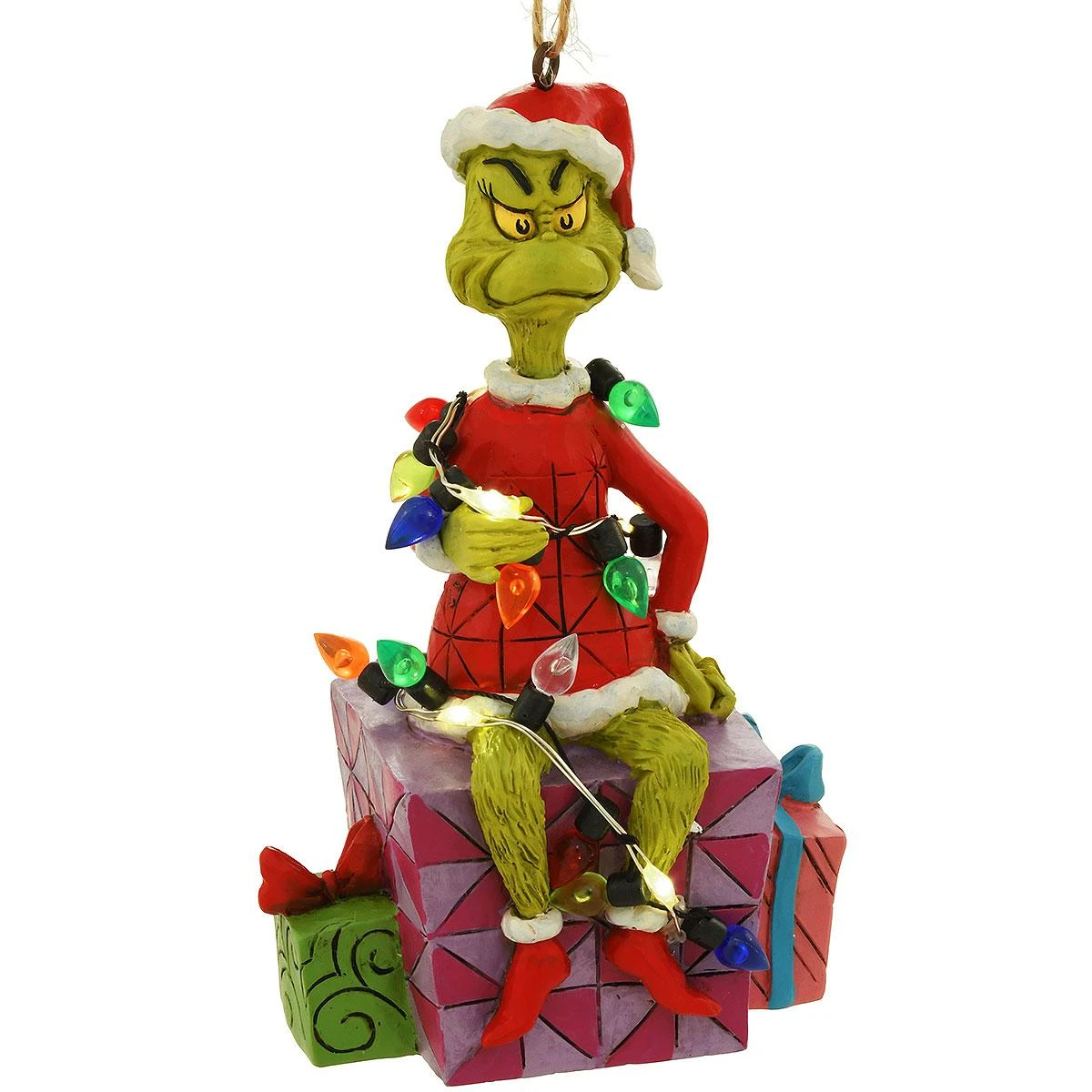 Inspired by the Dr. Seuss classic, this de-light-ful ornament depicts the Grinch sitting atop a pile of presents, wrapped in Christmas lights. Resin figure is embellished with a variety of vivid glazes and quilted patterns with select lights that really glow! 4¼” ornament comes ready to hang on a twine cord. Requires 3 LR44 batteries, included. Part of Jim Shore’s © “How The Grinch Stole Christmas” collection 6012709
