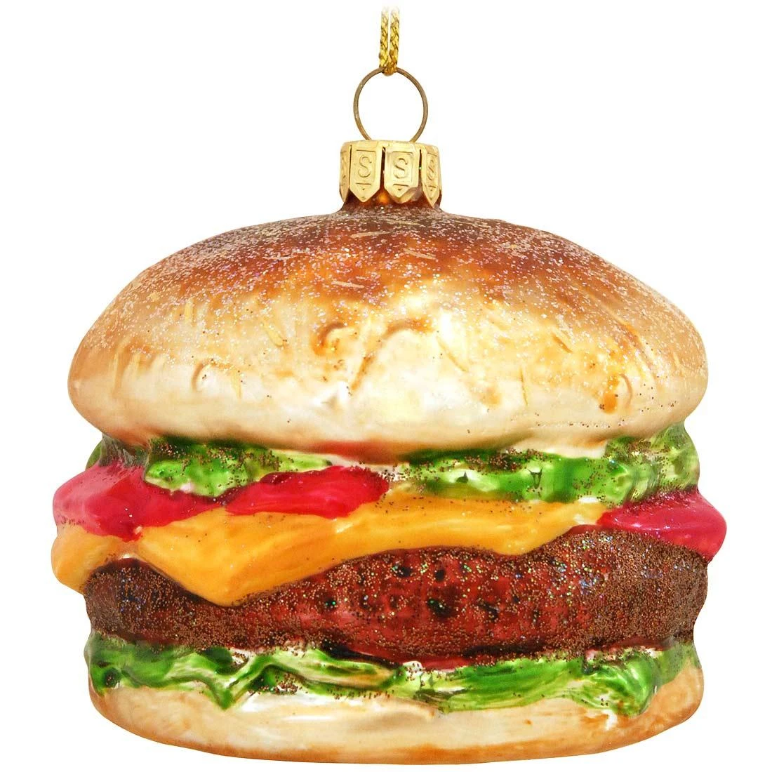 Lettuce help you decorate your tree with a delectable keepsake that will add fast food appeal! Masterfully crafted from glass, this 2¼” tall ornament builds a burger with a giant beef patty, two pieces of sumptuous green lettuce, melting cheese and gobs of ketchup on a seeded bun all salted with glittering accents. Coming ready to hang with a gold cord, our hamburger ornament will make a great gift that is sure to have your loved one saying cheese and thank you!