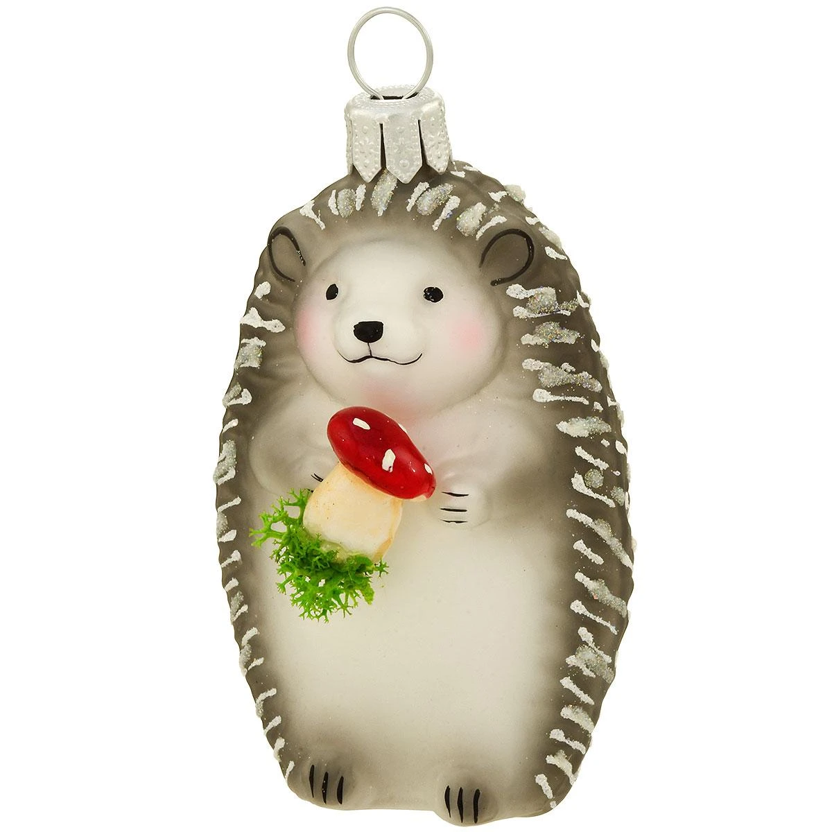 Plucking a toadstool from the mossy forest floor, this feisty gray hedgehog plods merrily along. Glass ornament is adorned with bright glazes and sparkling glitter accents and is skillfully handcrafted in Poland. Measures 2¾”. Bronner’s Symbol of the Hedgehog card included.