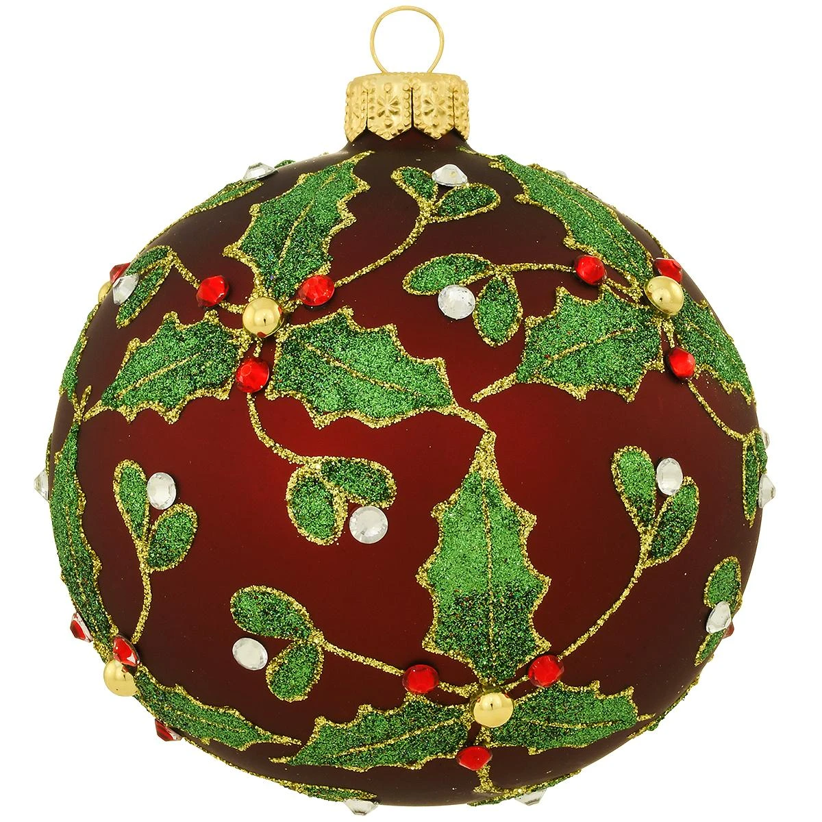 Happy holly-days are headed your way with this festive burgundy design! Expertly hand-crafted in Poland, 3¾” glass ornament features glittering green holly leaves festooned with gold beads, ruby red jewels, and clear acrylic gems. It’s sure to make the yuletide bright!Â