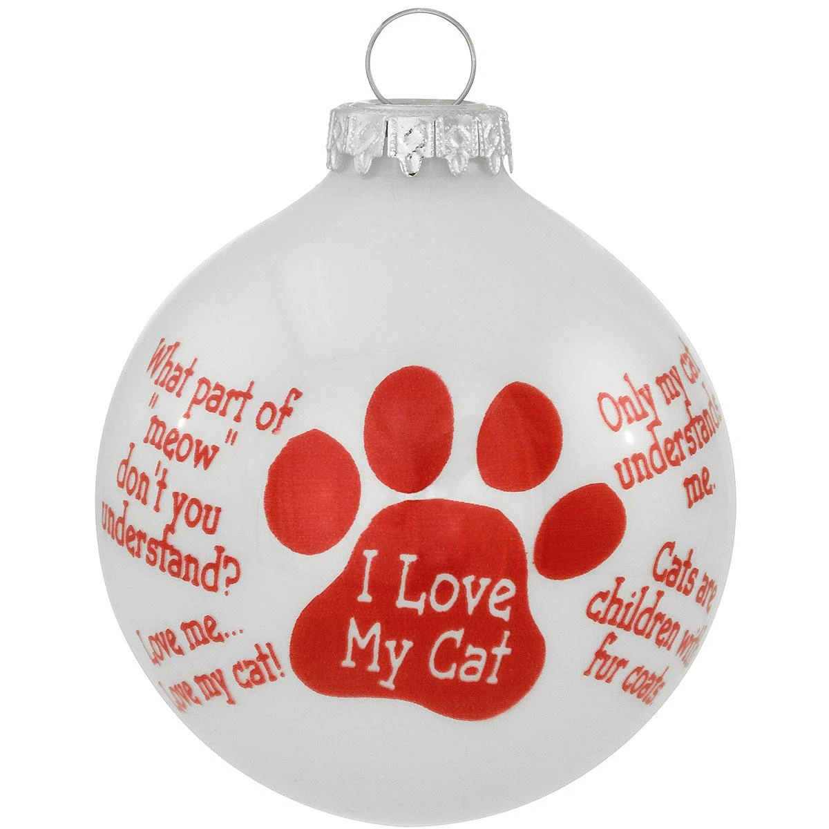 Delightful cat-themed sayings in vivid red decorate this shimmering white opal ornament along with the motto I Love My Cat printed in a large, red paw. Crafted exclusively for Bronner’s from glass in Hungary, our adorable 3″ ornament makes a wonderful gift for your special cat lover and features the following phrases:
