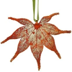 Turn a new leaf this holiday and decorate with the beauty of nature! This gorgeous ornament is actually a real Japanese maple leaf preserved to keep its natural veins visible through a process that takes a minimum of 7 days. Accented with iridescent copper, this gorgeous leaf ornament is crafted in the USA and comes ready to hang with a ribbon attachment. This brilliant keepsake will add a natural touch to your Christmas tree or windowpane! Each one-of-a kind leaf ranges in size with an approximate measurement of 4″ tall.Â