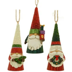 These Christmas gnomes come to life through Jim Shore’s distinctive knack for blending folk art and quilting patterns into an artistic masterpiece! Each measuring 3″ tall, this resin gnome trio is painted in red, green and white for Christmas cheer gnome-body will be able to resist! Coming ready to hang with twine cords, this mini Christmas gnome ornament set is part of the Heartwood Creek collection. #6009186