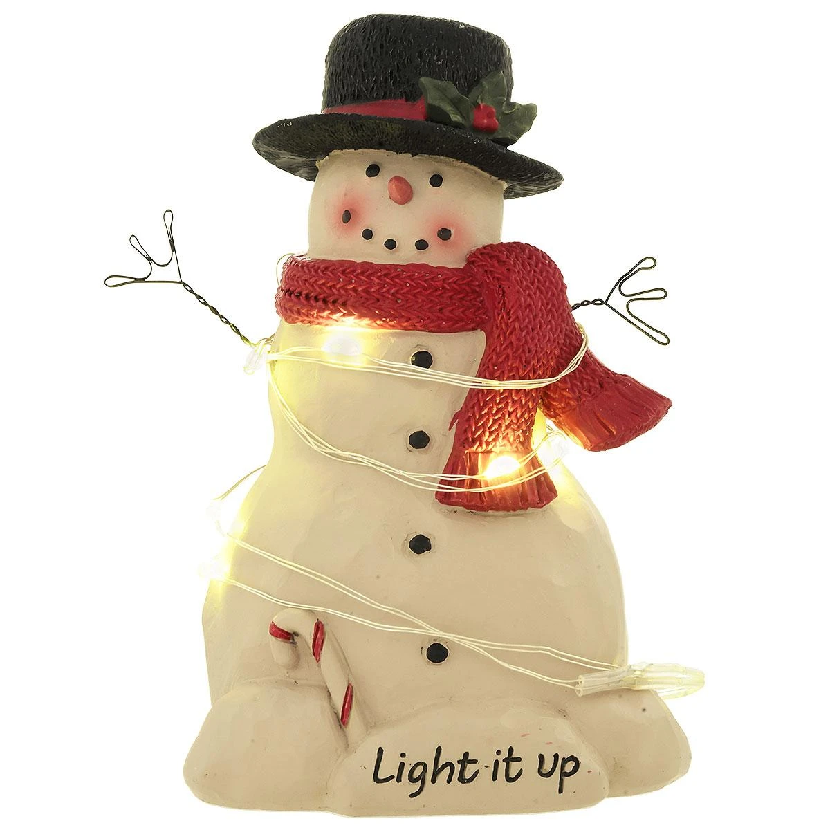 This charming snowman, dressed in top hat and red scarf, is draped in a light string glowing with bright LED lights. Complete with candy cane and “Light it up” sentiment, this heartwarming figure is sure add a warm glow to your holiday décor! 4½” figure is crafted of resin and wire and includes cell battery and on/off switch.
