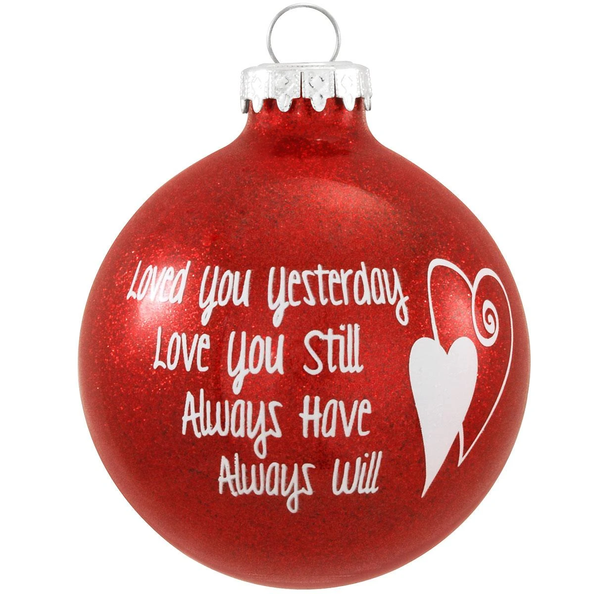 The heart-felt sentiment Loved You Yesterday Love You Still Always Have Always Will is prominently featured on this charming ornament. Artfully crafted in of glass exclusively for Bronner’s from Hungary, our 3″ tall Loved You Always Will ornament features an interior coating of sparkling red glitter. This Loved You Yesterday Love You Still Sparkle glass ornament will make the perfect keepsake for that special love in your life whether on a special occasion or just because!