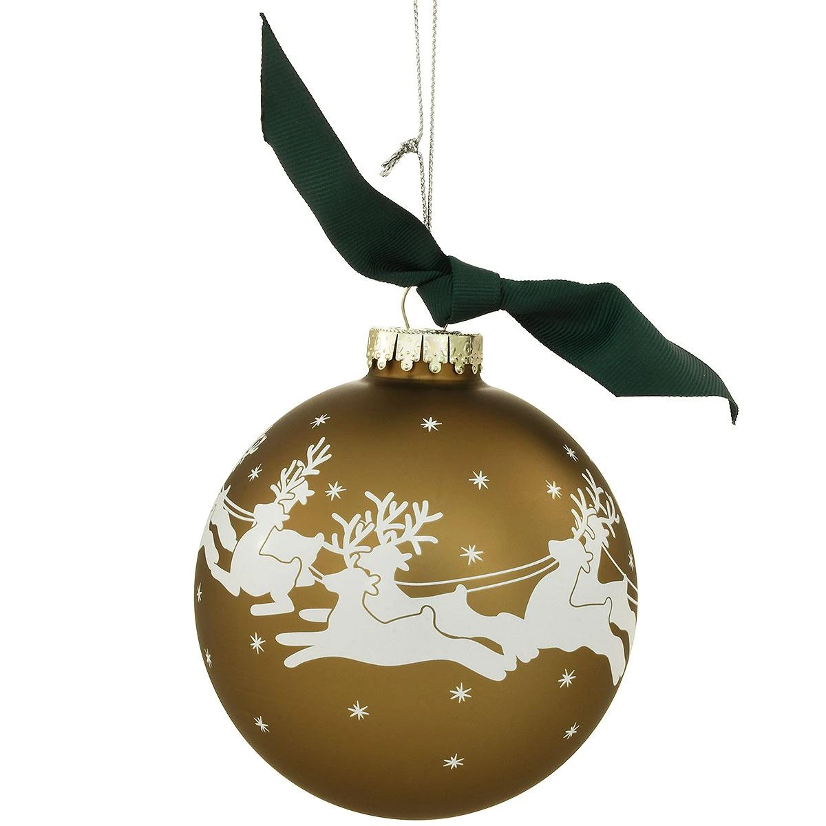 Snowflakes tumble through the sky as Santa’s sleigh takes flight pulled by a team of magic reindeer! Shimmering with a bright gold/bronze surface, our 4″ Santa ball features a variety of colorful graphics with the sentiment “Merry Christmas to All”. Embellished with a hunter green ribbon, ornament comes ready to hang on a silver cord.
