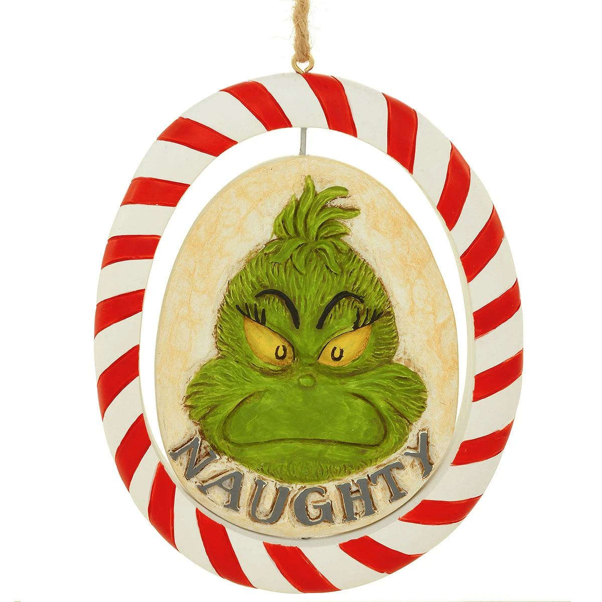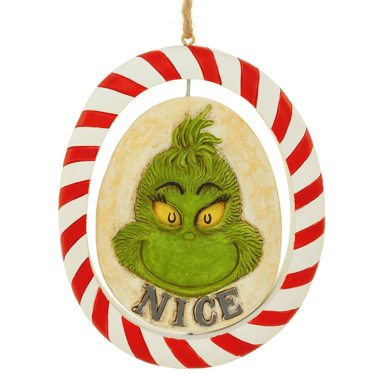 Masterfully designed with all the charm you’ve come to love from Jim Shore, this 4½” tall ornament reminds us of the classic Christmas tale, “How The Grinch Stole Christmas,” when the greedy Grinch’s heart grew three sizes through a fun, reversible design. Within an oval candy cane frame, a rotating disc displays a frowning Grinch on the “naughty” side, while a smiling Grinch graces the “nice” side. Coming ready to hang with a jute cord, this stone resin Grinch ornament should “steal” a spot on the tree of any Who who’s a fan of the Dr. Seuss holiday classic!Â