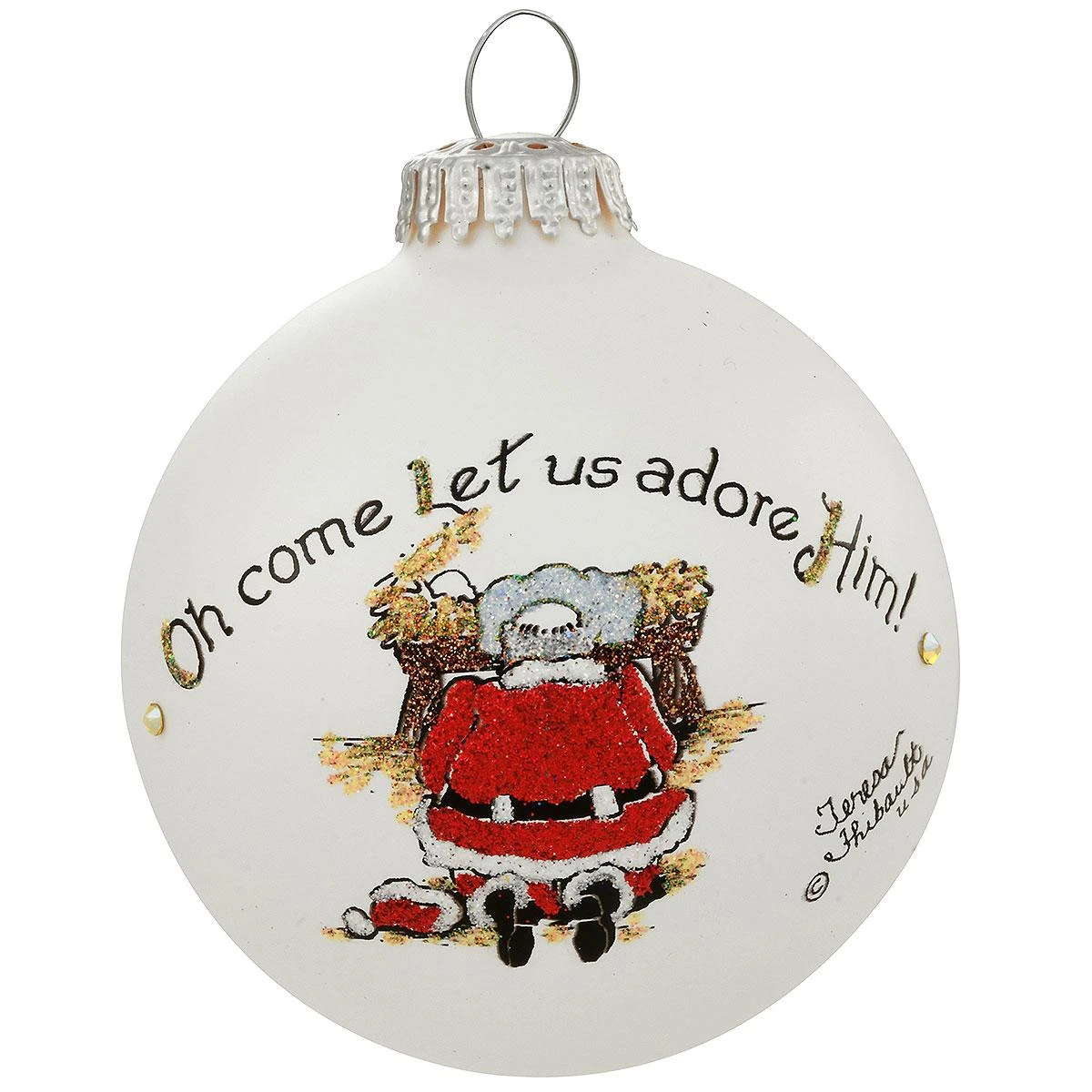 Santa is depicted kneeling before the manger of the Christ child imploring all with the message: Oh come Let us adore Him! Handcrafted of glass in the USA, this meaningful Heart Gifts ornament by Teresa Thibault shimmers with inspired brushstrokes, colorful glitter, and a sprinkling of dazzling Swarovski crystals. 3¼” keepsake comes attractively packaged for safe storage and easy gift giving and makes a great gift for everyone on your CHRISTmas list!